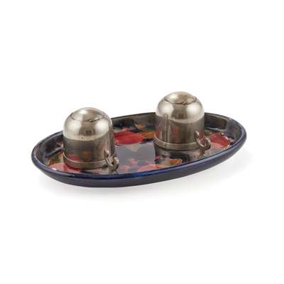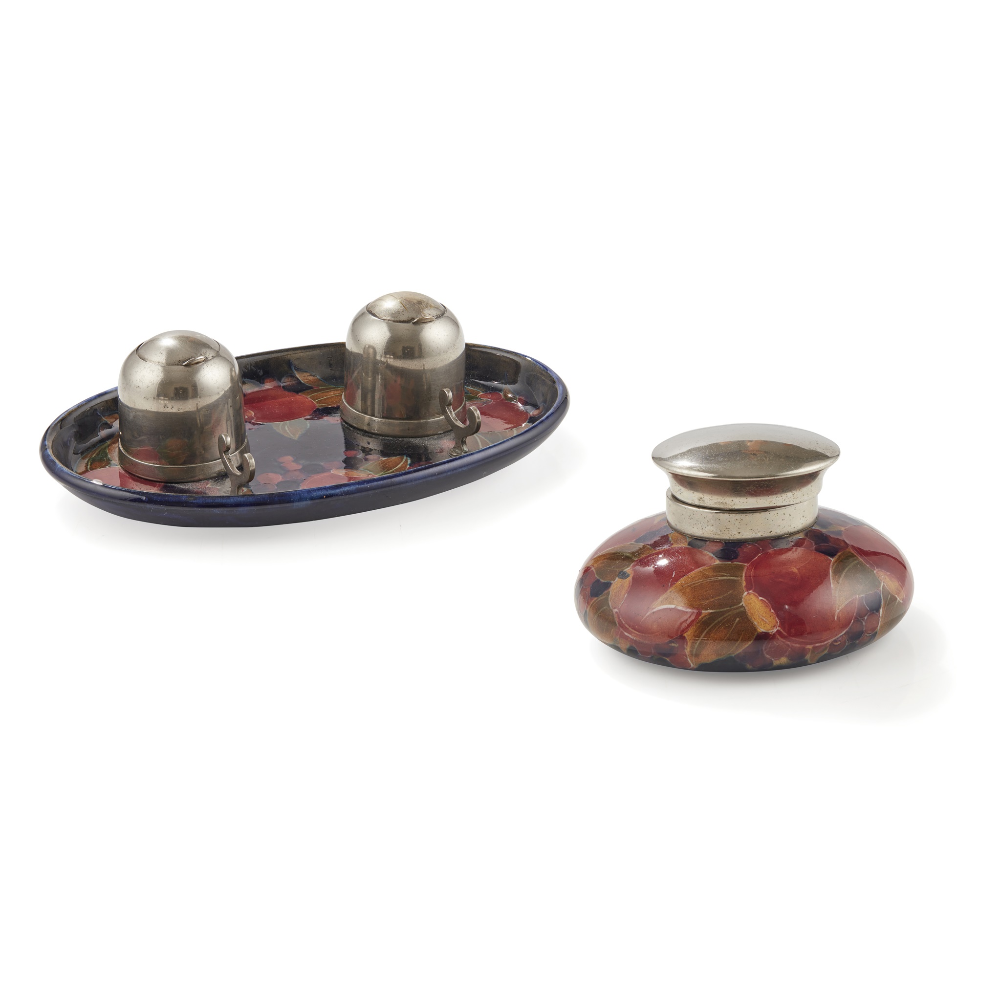 Glazed earthenware, with white metal inkwells, impressed MOORCROFT/ BURSLEM, 20cm across; together with a further ‘POMEGRANATE’ INKWELL, by William Moorcroft, glazed earthenware with white metal mount, painted initials WM in green, impressed MOORCROFT, 7.5cm high