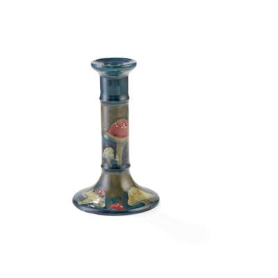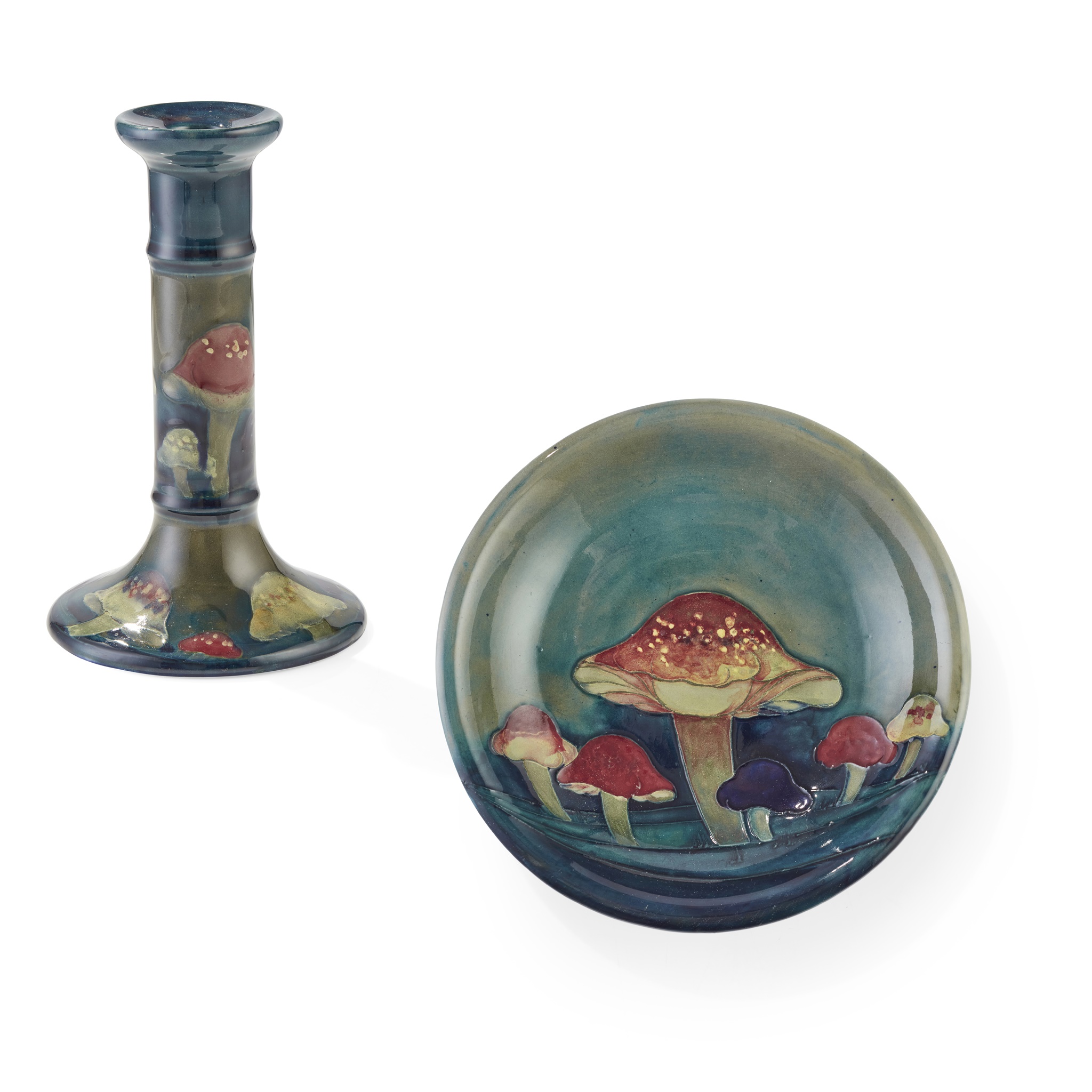 glazed earthenware, painted initials WM in blue, impressed MOORCROFT/ MADE IN ENGLAND, 19cm diameter; together with a ‘CLAREMONT’ PATTERN CANDLESTICK, by William Moorcroft, glazed earthenware, painted initials WM in blue, impressed MOORCROFT/ MADE IN ENGLAND/ 69, 19cm high