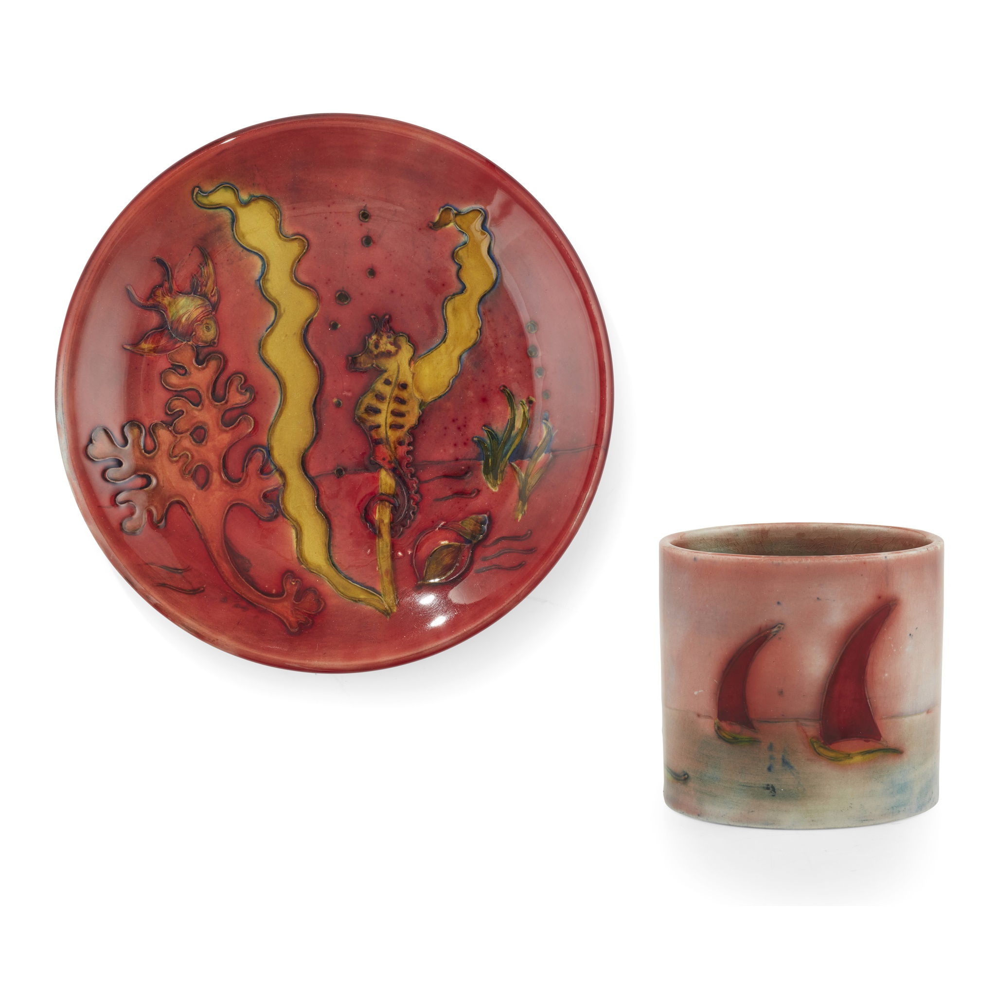 glazed earthenware, impressed MOORCROFT, 6.5cm high; together with a FLAMBÉ ‘MARINE’ PATTERN PLATE, CIRCA 1955, by Walter Moorcroft, glazed earthenware, painted initials WM in blue, impressed MOORCROFT/ MADE IN ENGLAND, 26cm diameter