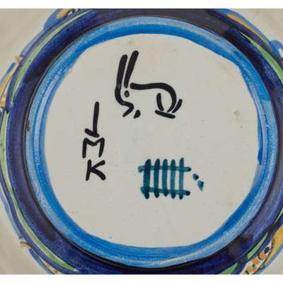 Note: Despite the disapproval of her parents Jessie Marion King pursued her early artistic promise and enrolled at the Glasgow School of Art in 1892. There she was encouraged by the inspirational, liberal Headmaster, Fra Newbery, to maintain her 'child-like vision' while developing her natural gift for linear expression. Primarily known for her book illustrations, King also designed an array of intricate silver and jewellery pieces for Liberty’s of London. After marrying the artist E. A. Taylor, the pair lived in Salford, following a stay in Paris, before eventually settling at her residence, ‘Greengate’, in Kirkcudbright in 1915. Here, they ran summer schools in Arran and befriended young emerging artists such as Cecile Walton, S.J. Peploe and Anne Redpath, all of whom became prominent figures in the town. By the 1920’s King established the ‘Green Gate Close Coterie’ a group of women artists who were King’s tenants in the cottages she renovated on Green Gate Close and this only further contributed to the close-knit community of artists living and working in an exciting hub of creativity. During this time, as well as continuing with her book illustrations, King turned her attention to ceramics and began painting on pottery blanks, which were sold exclusively through Paul Jones's Tea Rooms in Kirkcudbright. Her love for ‘green gate’ features on all of her pieces as she used this motif to sign her pottery. Throughout her varied professional career, King retained a distinctly individual style as she chose not to draw from life, but instead from ‘her own mind’, conjuring up fantasy-like scenes of fairies and pixies on enchanting adventures.