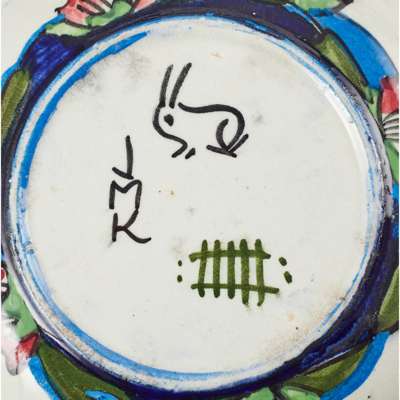 painted and glazed earthenware, comprising a VEGETABLE TUREEN & COVER, 28cm across; TWO OVAL SERVING DISHES, 22cm long; a SERVING BOWL, 18cm diameter; FOUR COVERED BOWLS, (one with cover lacking), cover 12.5cm diameter, bowl 11.5cm diameter; SIX PLATES, 20.6cm diameter, and a MUSTARD POT, with matched cover signed by Mary L. Fairgrieve, 6.5cm high, each painted with a waterlily design, signed to each with monogram and Greengate and rabbit cyphers