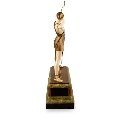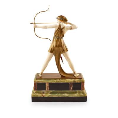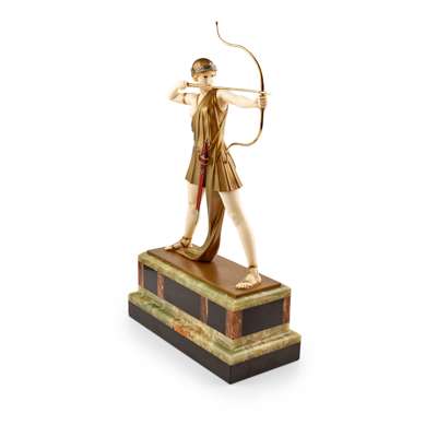 Note: At the beginning of the 20th Century the German Ferdinand Preiss established a company with Arthur Kassler known as Preiss-Kassler and until his death in 1943 he continued to design sculptures. Regarded as one of the most important Art Deco sculptors, he is acclaimed for his popular mixed media (chryselephantine) figures which were affordable to the middle class and appropriately sized for the home. His works were usually based on classical and mythical subjects, such as The Archer, circa 1925, which appears to represent Diana the huntress from Roman mythology. Amongst his other favoured subjects were idealised children, women at leisure sunbathing or holding parasols, or figures involved in sporting endeavours such as ice-skating, playing tennis, football or golf, or even javelin throwing. Preiss' Archer was executed in two sizes, the present lot representing one of only a few known examples of the rare larger variant.