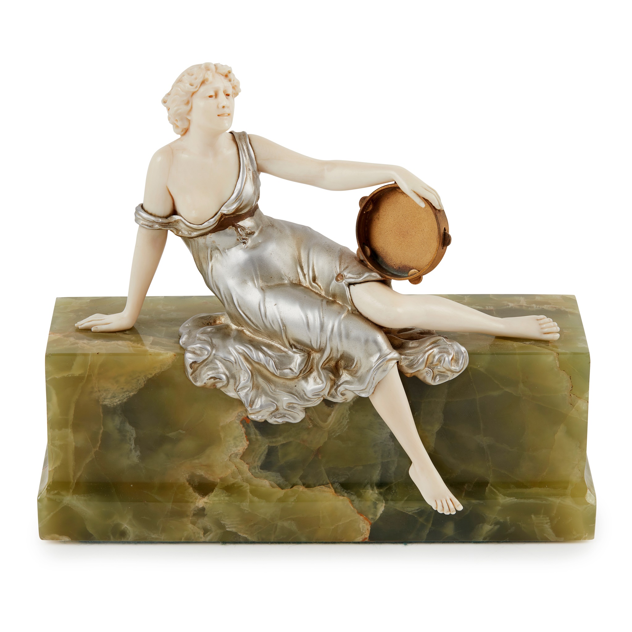 cold painted bronze, carved and painted ivory, onyx, etched to rear of plinth F. PREISS