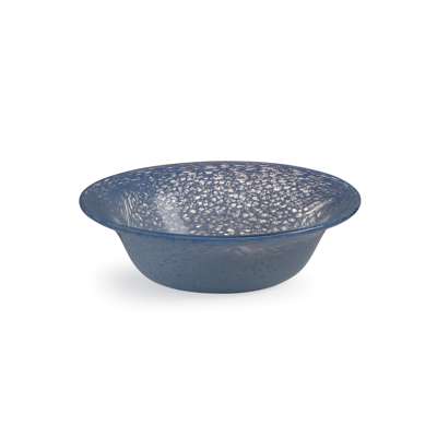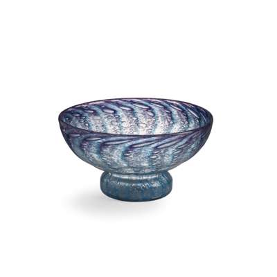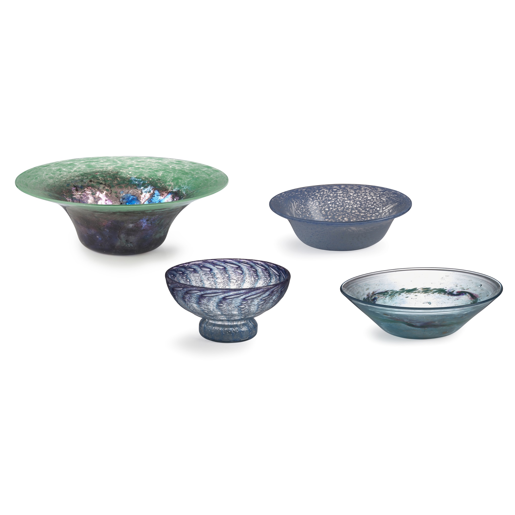 marbled green, blue and brown glass, 39cm diameter; together with THREE 'MONART' BOWLS, CIRCA 1930, blue glass with bubble inclusions, one with aventurine inclusions, 27cm; 23cm and 24cm diameter