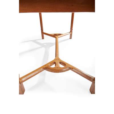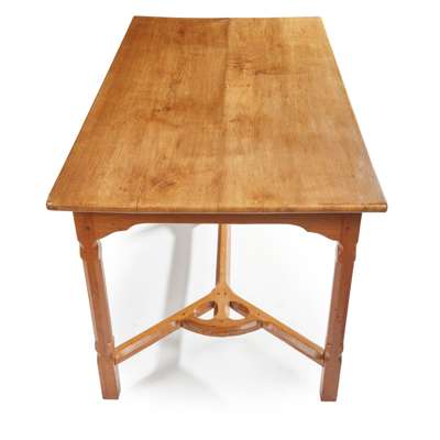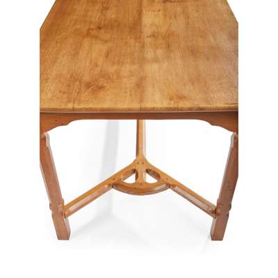 Note: Tables of this design, with chip-carved detail to the table edge and apron, were supplied by Gimson to the agricultural reformer Hugh Fairfax-Cholmeley (1864-1940) at Brandsby Hall, near York. Gimson produced variations of his designs in different woods and qualities of timber, depending on the wishes of his clients and what they could afford. Waals continued the Gimson tradition after his death, making furniture to his designs and acquiring the stock of seasoned timber and equipment from his executors.