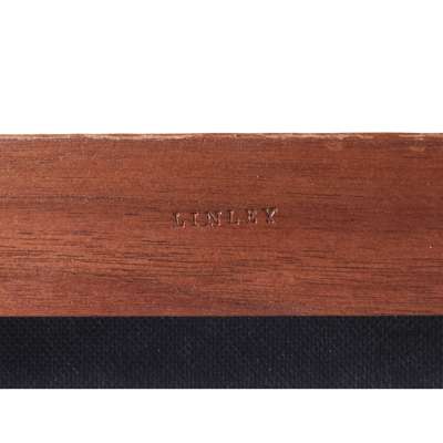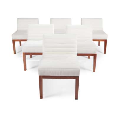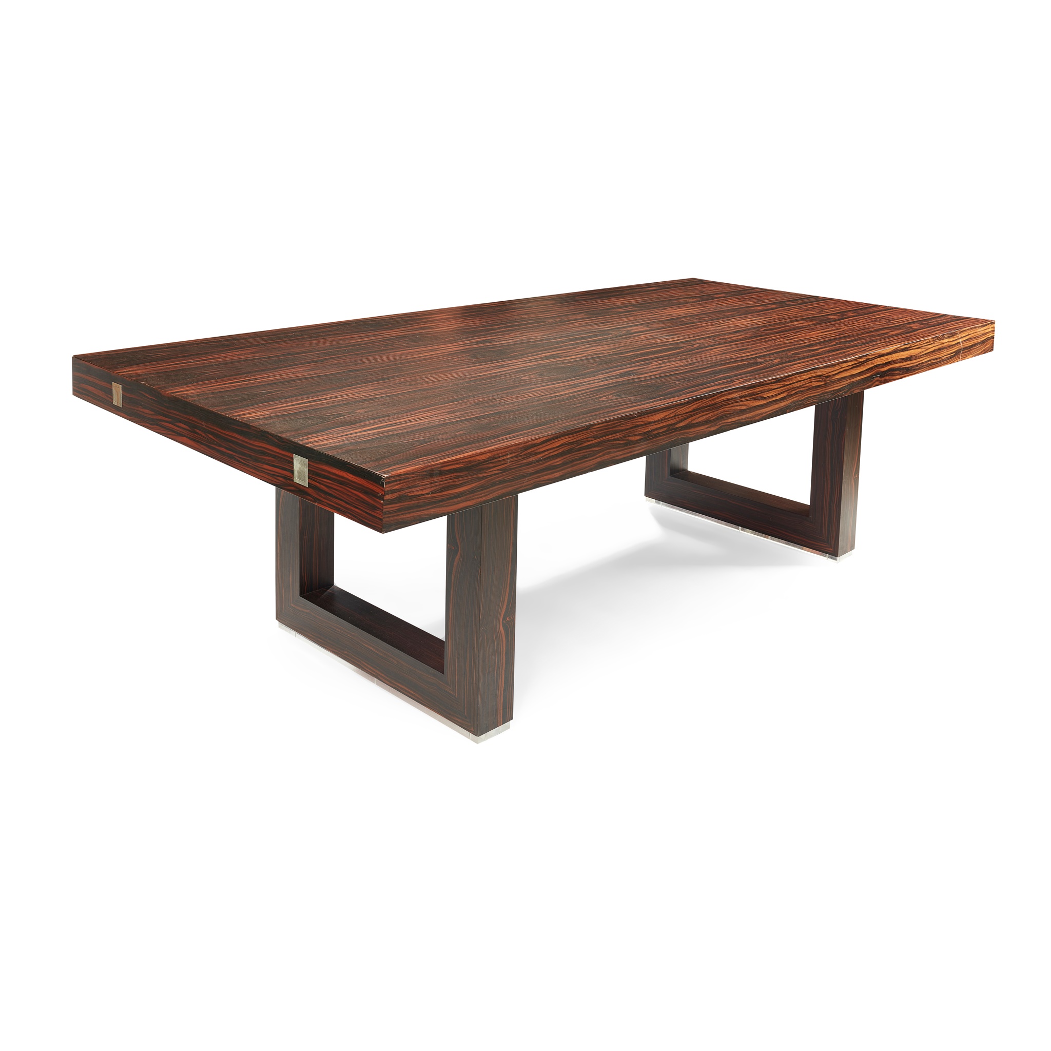 Macassar ebony and chromium-plated metal and Perspex, each end opening to fitted drawers , stamped LINLEY to drawer handles, 230cm wide, 74cm high, 110cm deep; together with a set of EIGHT ‘DICE’ CHAIRS, including two carvers, by David Linley, walnut with cream upholstery, all stamped LINLEY with maker’s fabric labels, carver 61cm wide, 71cm high, 61cm deep