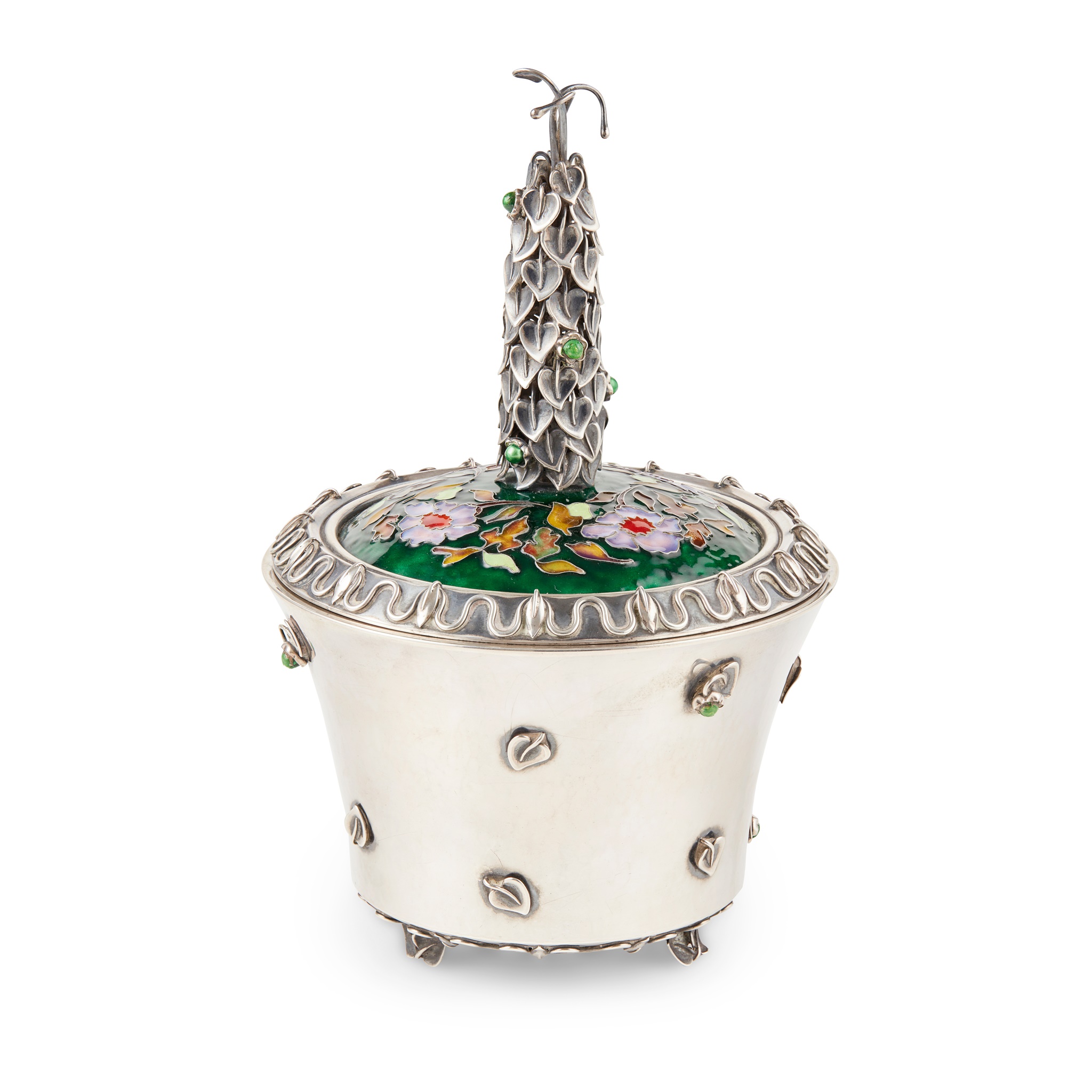 Cover - unmarked metal work all in good order, green cabochons all present, enamel work all in good order, engraving to underside of good quality and clear