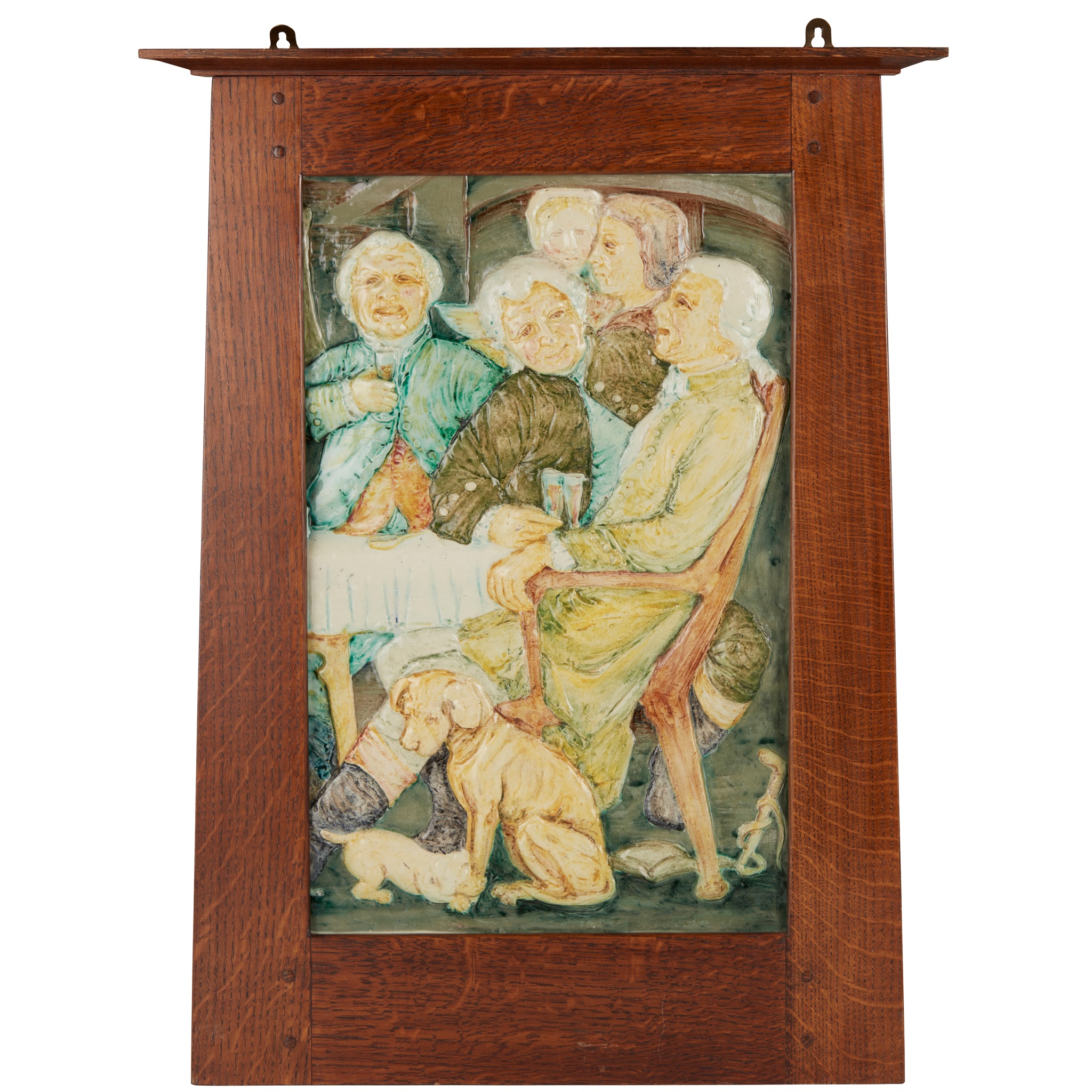 glazed polychromed terracotta, oak frame