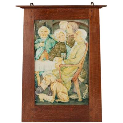 Note: Benjamin Creswick was a sculptor and teacher based in Birmingham. He was a founder member of the Century Guild along with A.H. Mackmurdo and William de Morgan. He lived in Liverpool briefly in the 1880s. He will have been known to Philip Rathbone, and he carved figures for Wallasey Memorial Unitarian Church, designed by Harold Rathbone’s partner Edmund. The full extent of Creswick’s work for Della Robbia is not known, however, the closing sale of the company included a ‘finely modelled panel – “Merry Drinkers” in low relief, By Mr Creswick, of Birmingham School of Art’, possibly this panel.
