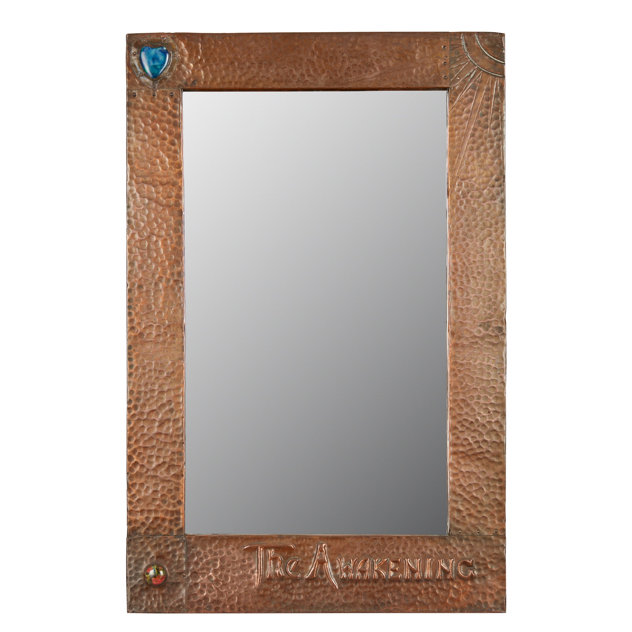 copper, Ruskin ceramic inserts, mirrored glass, bears repoussé inscription THE AWAKENING