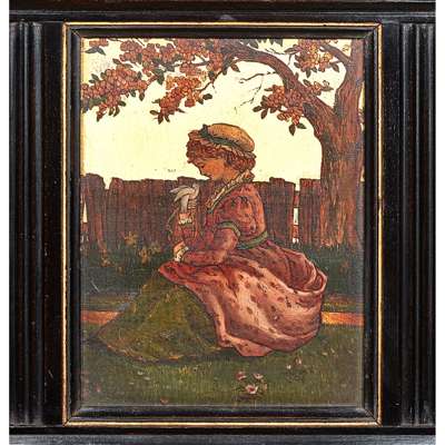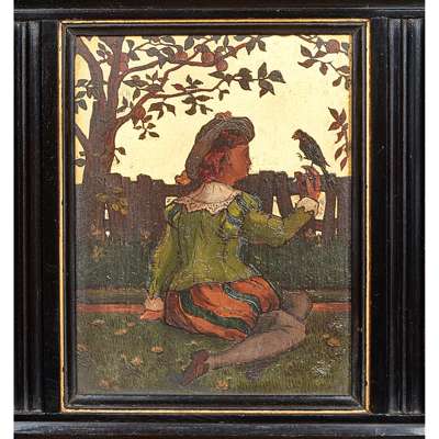 ebonised wood with gilded embellishment, glass, painted panels, stamped to door GILLOW & CO/ L5647