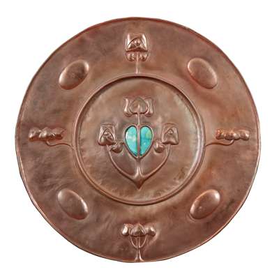 ARTS & CRAFTS COPPER AND ENAMEL WALL CHARGER, CIRCA 1900