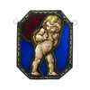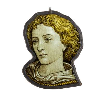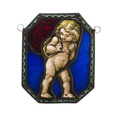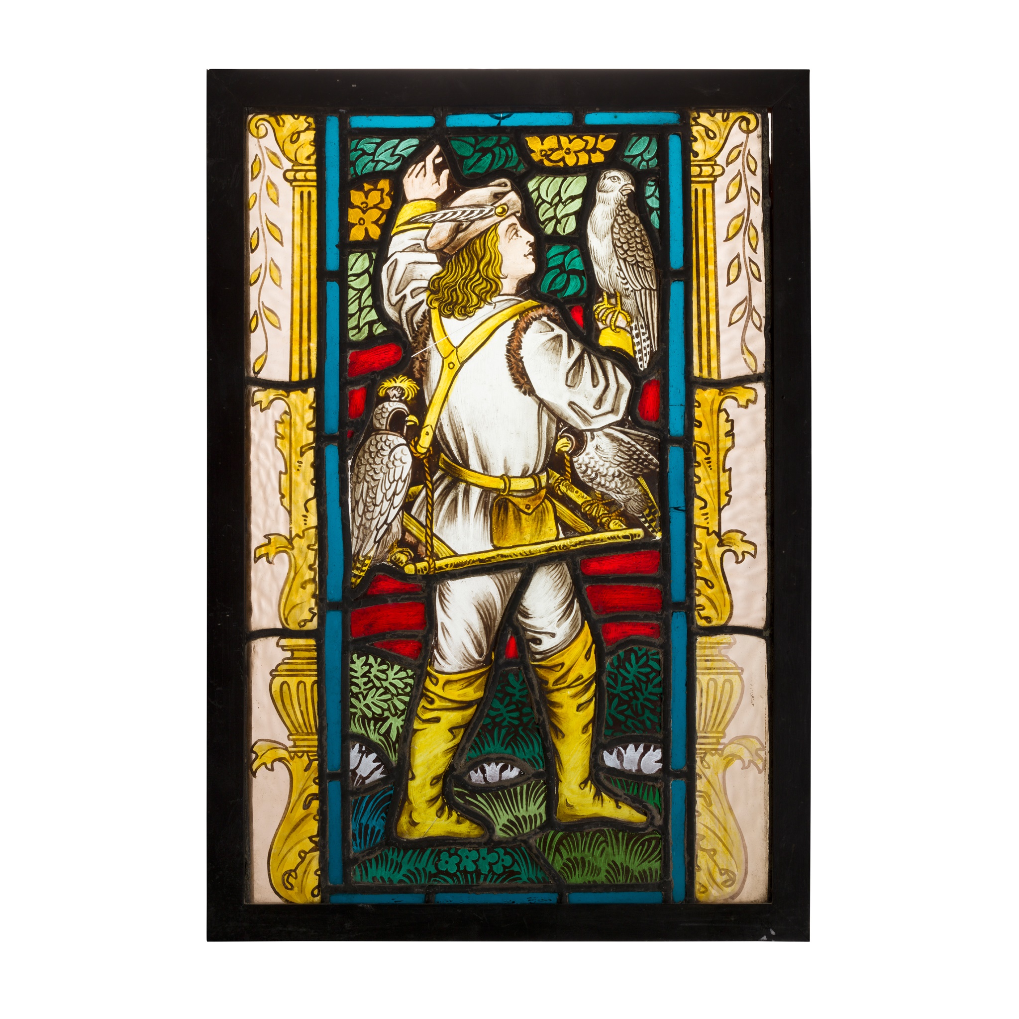 stained, leaded and painted glass, comprising a ROUNDEL, 26cm diameter, PANEL, depicting a falconer, framed, 44.5cm x 29.5cm; a FACETED PANEL, depicting a putto, 21cm x 17cm; and a FRAGMENT PANEL, of the head of young man, 16cm x 12cm