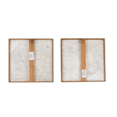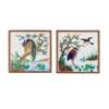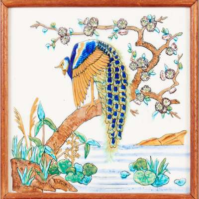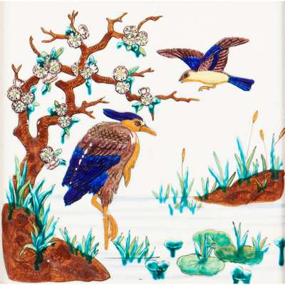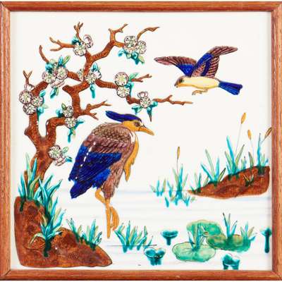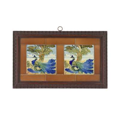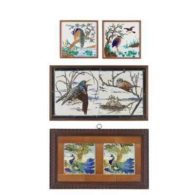 glazed earthenware, later framed, each 20cm square; together with a TWO-TILE PANEL, glazed earthenware, each 20cm square, later framed; and a further TWO-TILE PANEL, glazed earthenware within tiled border, later framed, each 15cm square