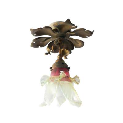 brass and copper, with opalescent glass shade, 41cm tall; and a W. A. S. BENSON-STYLE CEILING LIGHT, brass and copper, with associated opalescent and cranberry glass shade, 25.5cm diameter