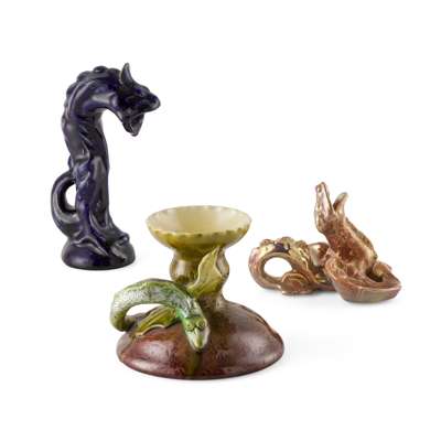glazed ceramic, impressed maker's mark/ LEEDS/ 2174, 11.5cm across; a BURMANTOFTS FAIENCE CANDLESTICK, glazed ceramic, impressed BURMANTOFTS FAIENCE 834, 11cm high; and a ROYAL DOULTON FIGURAL SPOUT, glazed ceramic, impressed maker's mark, 17.5cm high
