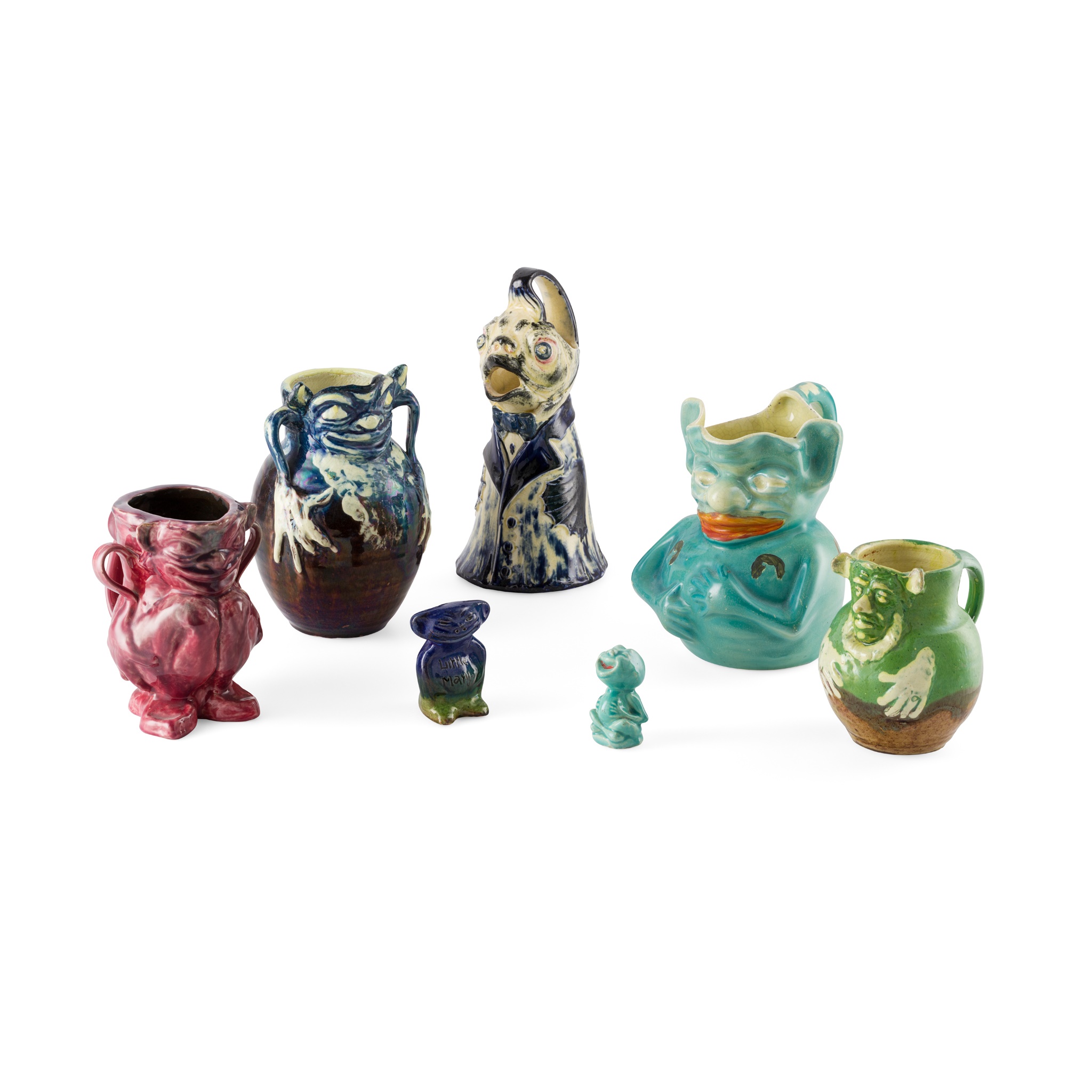 glazed ceramic, to include a BARUM JUG, incised BARUM BARNSTAPLE VULLIAMY, 18cm high; TWO FURTHER BARUM JUGS, each incised BARUM BARNSTAPLE, 13.8cm and 12cm high; a BARUM FIGURE, inscribed to the body LITTLE MARY and incised BARUM BARNSTAPLE, 7.5cm high; a WARDLE JUG, impressed WARDLE/ ENGLAND/ 2155, 22.5cm high; a MOULDED JUG, unmarked, 16cm high; and a MOULDED IMP FIGURE, unmarked, 6cm high