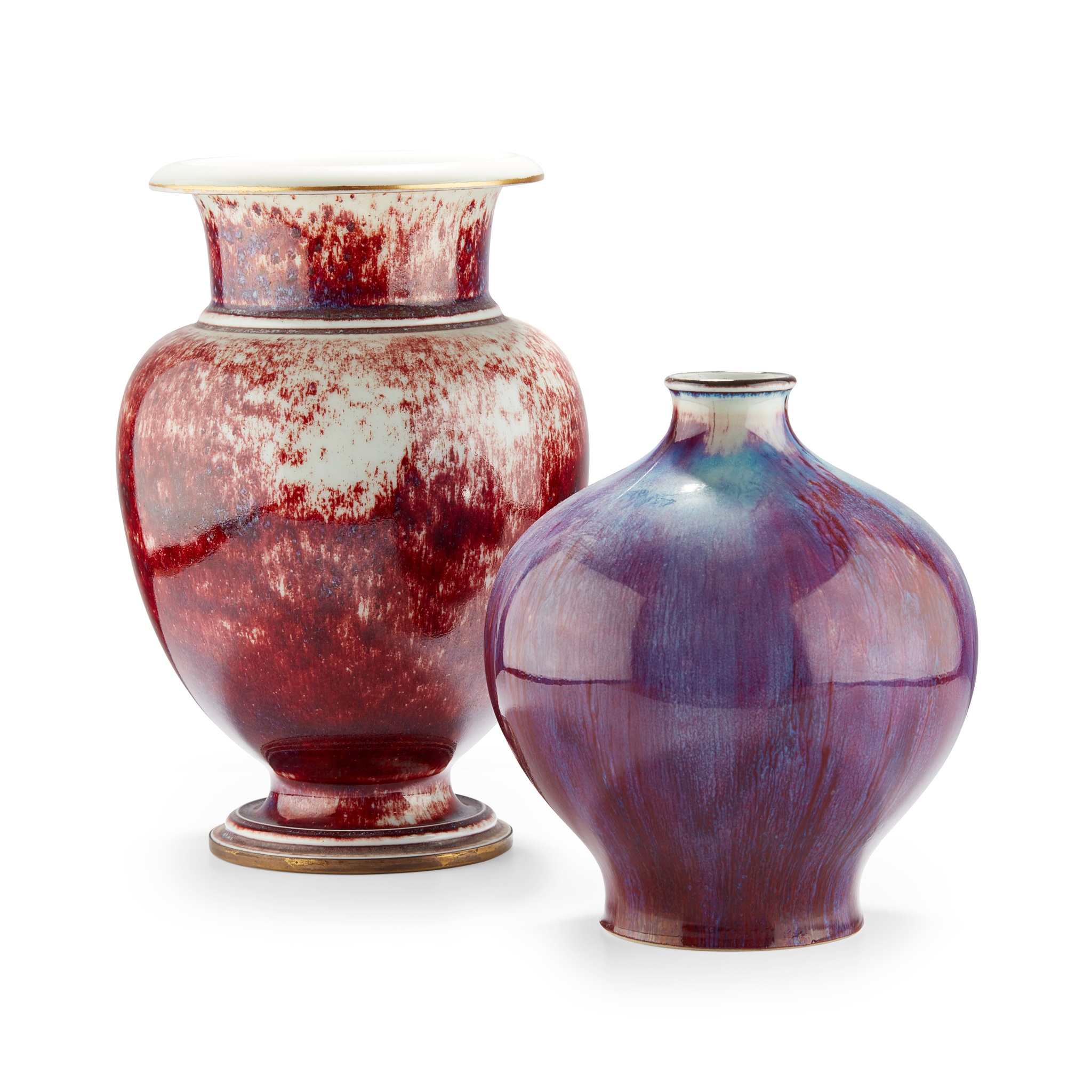 one with pâte nouvelle porcelain with flambé glaze, brass mount and gilt rim, orange printed Sèvres mark, black printed S. 87, painted O.51., 24cm high; the other pâte dure ancienne, green printed S. 1927/ DN/ MADE IN FRANCE, incised H27 2 PN, 17cm high