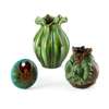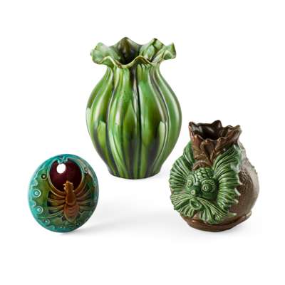 glazed ceramic, comprising a LARGE VASE, with frilled rim, applied mark, impressed 118/D, 25.3cm high; another VASE, with opposed moulded fish mask, applied mark, impressed 457, 18cm high; and a WALL POCKET, moulded with moth motif, unmarked, 13.3cm diameter