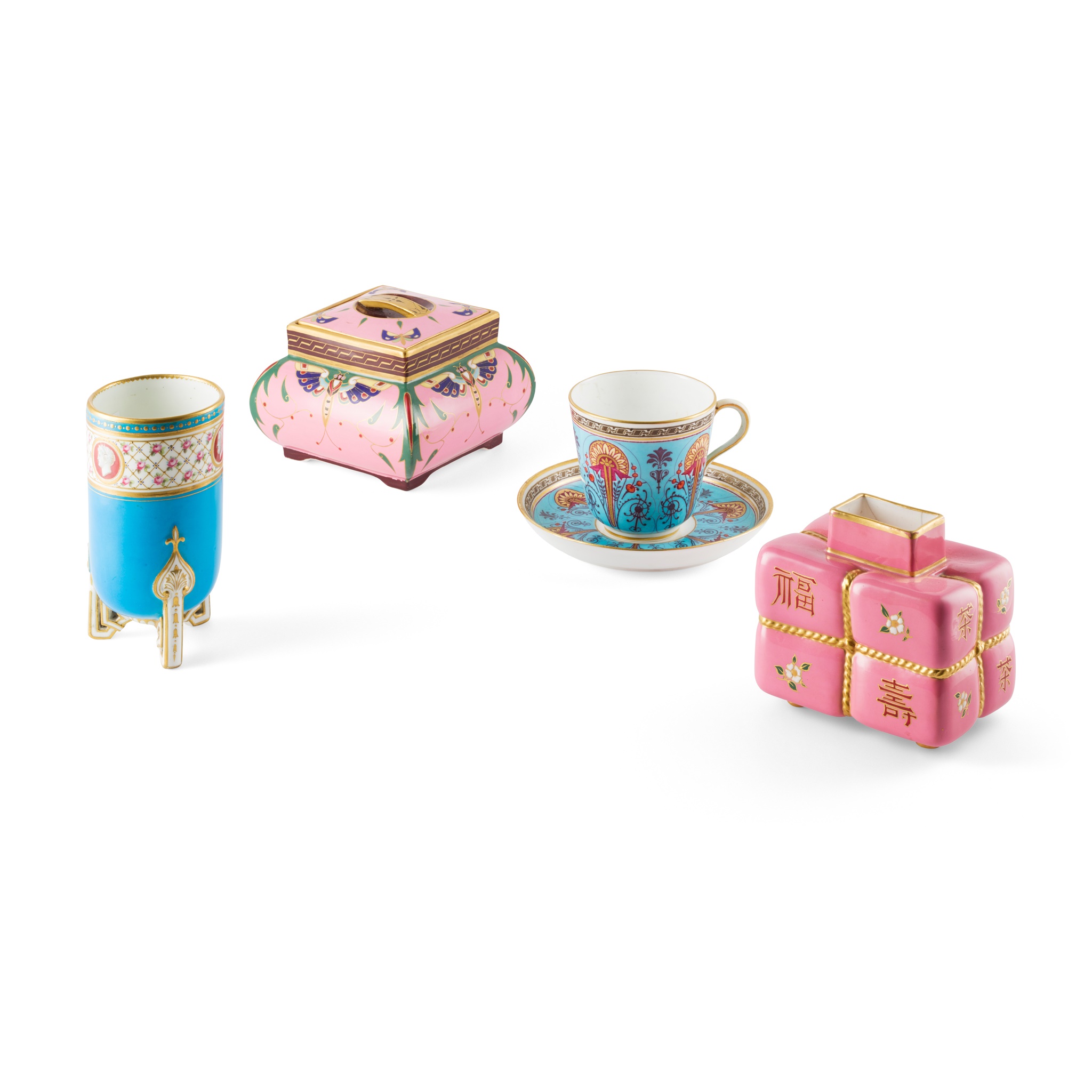 glazed earthenware with painted and gilded highlights, 10cm high; together with a BOX & COVER, impressed marks (indistinct), 9.5cm high; a TEACUP & SAUCER, red painted 332, saucer 13.5cm diameter; and a further VASE, 12.5cm high
