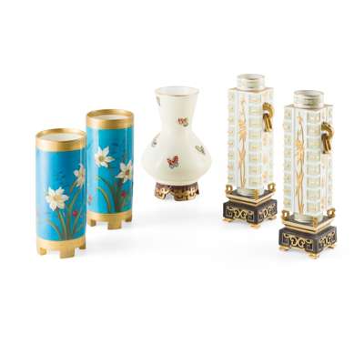 glazed porcelain with gilded highlights, each impressed MINTON (indistinct), 18.5cm high; together with a PAIR OF BROWNFIELD VASES, glazed earthenware, each impressed BROWNFIELD with moulded registration lozenge, 25.5cm high; and a further MINTON VASE, glazed earthenware with gilded highlights, with factory stamp and red-painted 20cm high
