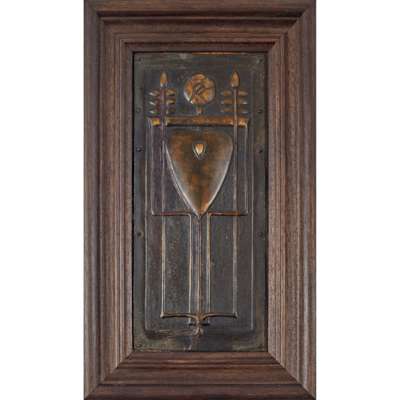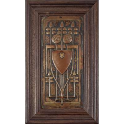 Note: After spending part of his early career working as an art editor in London, Talwin Morris took up a post as Arts Manager for Glasgow publisher Blackie & Son in 1898, a position he held until his death in 1911. He quickly became acquainted with Charles Rennie Mackintosh and the circle of artists associated with Blackie and the Glasgow School of Art, which had a significant influence on his work. Perhaps best known for his book designs, Morris also produced pieces of furniture, textiles and metalwork, which were incorporated into many of his decorative schemes, including his own home at Dunglass Castle and the refurbishment of W.W. Blackie's Printing Works where these panels formed part of an entrance screen. The panels demonstrate the key characteristics of the 'Glasgow Style', with their heavily stylised linear plant forms and 'Glasgow' roses.