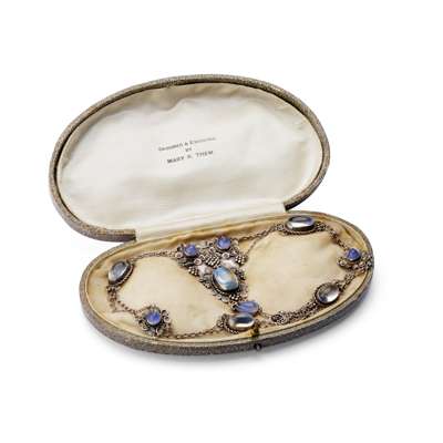 white metal, set with moonstone cabochons, within original presentation box, paper-covered card with padded silk and velvet lining, inscribed DESIGNED & EXECUTED BY MARY R. THEW