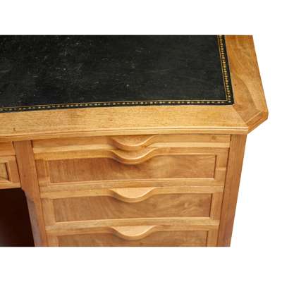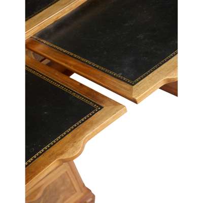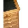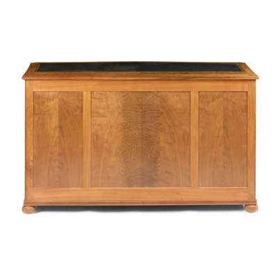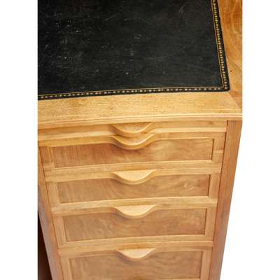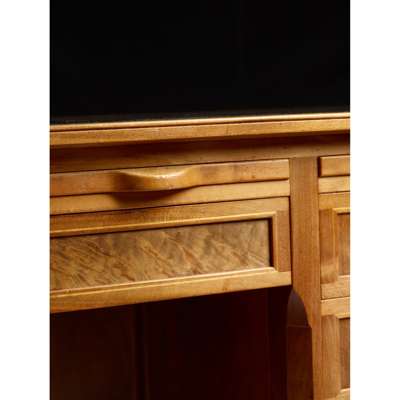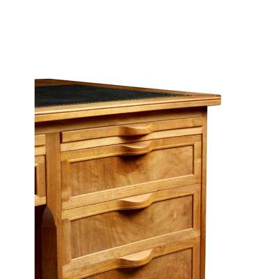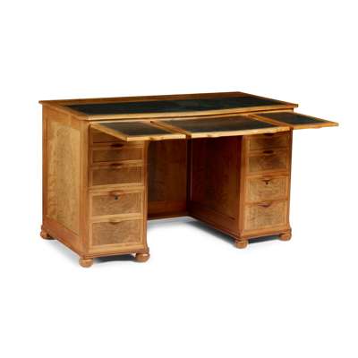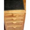 walnut, cedar and tooled leather, with three sliding shelves above an arrangement of ten drawers, one fitted with divider and one fitted with filing rack