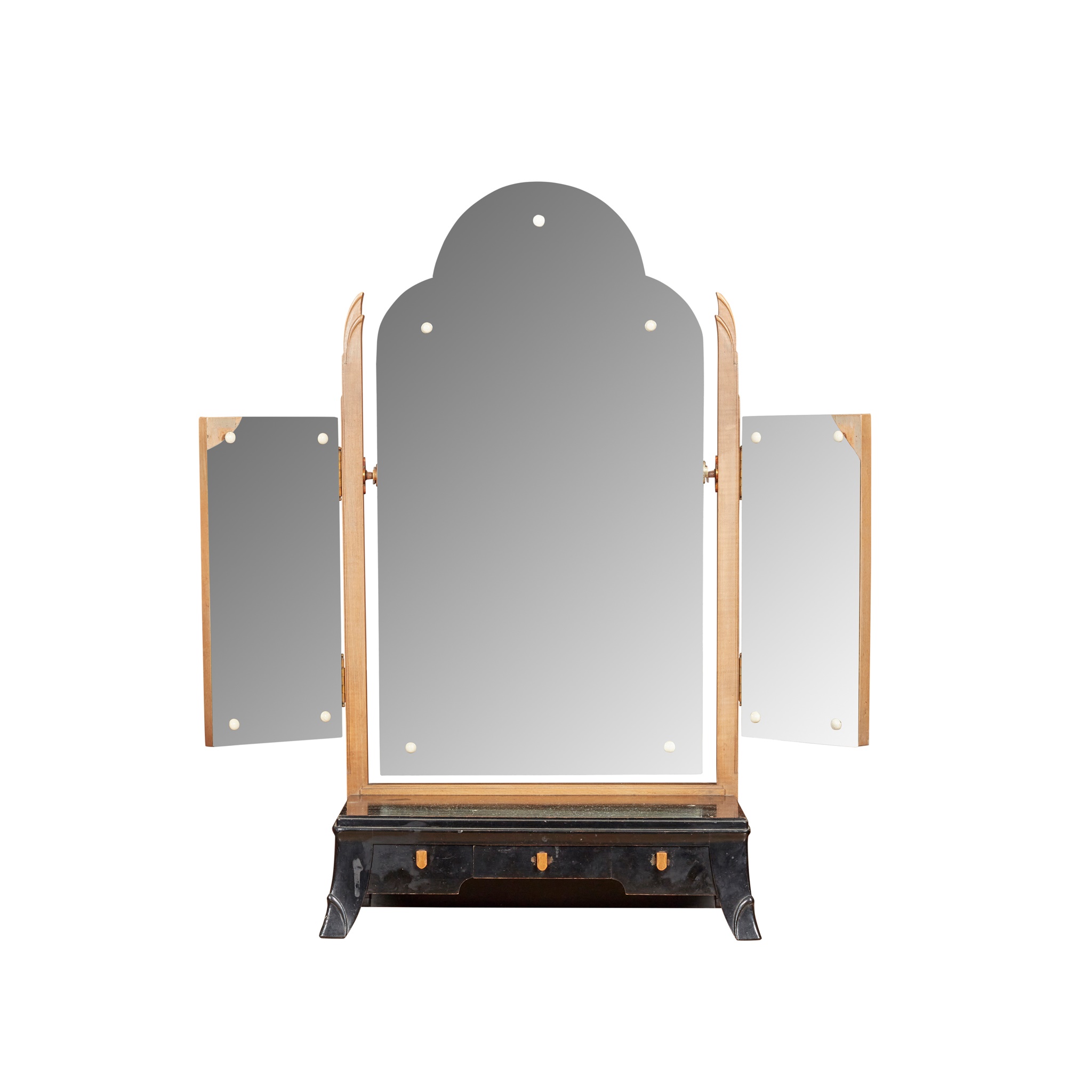 ripple sycamore veneer on mahogany construction with silver and ebonised detailing, ivory and mirrored glass