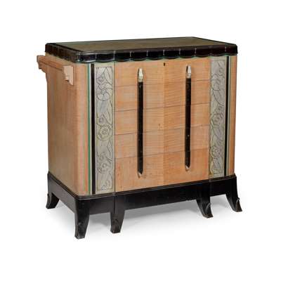 ripple sycamore veneer on mahogany construction with silver, ebonised and green lacquered detailing