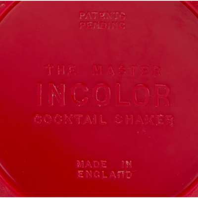 red Bakelite, chrome-plated metal, maker's marks THE MASTER INCOLOR COCKTAIL SHAKER / MADE IN ENGLAND / PATENT PENDING