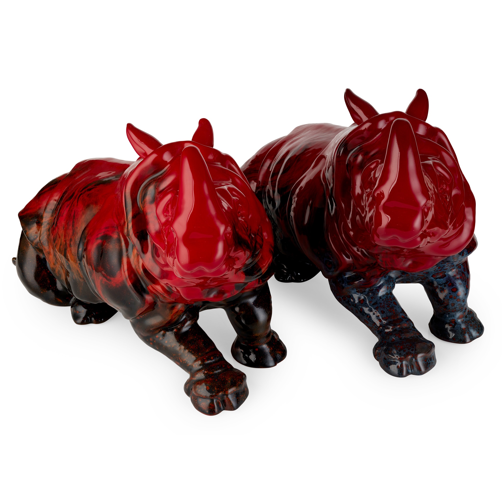 TWO VEINED FLAMBÉ RHINO FIGURES, MID-20TH CENTURY