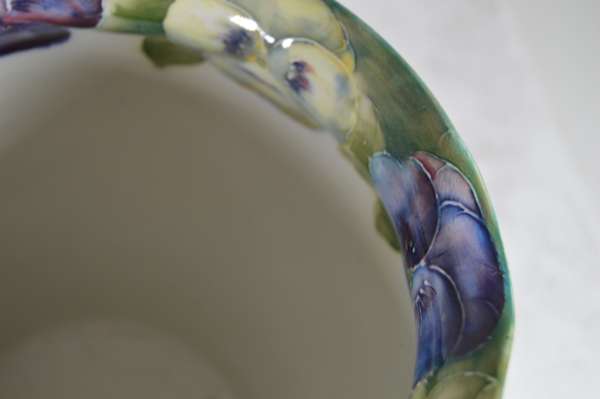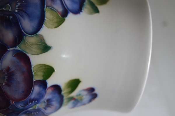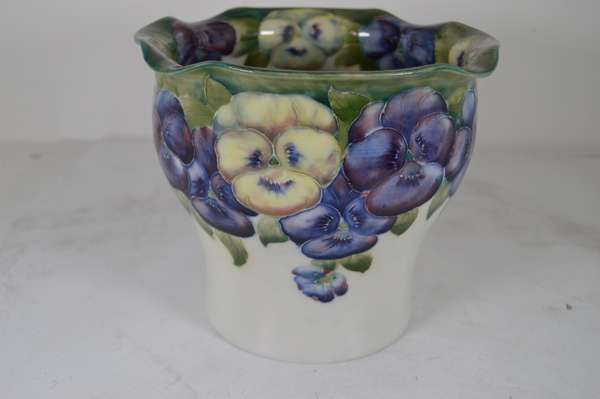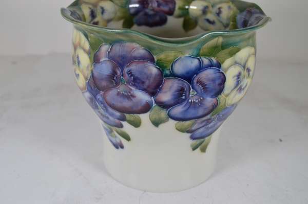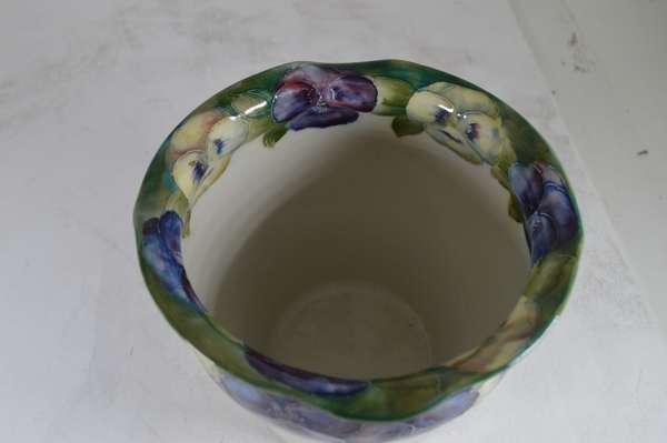 glazed earthenware, painted signature, impressed MOORCROFT/ BURSLEM, 7cm high; together with a 'PANSIES' PATTERN FLOWER POT, for James Macintyre & Co., glazed earthenware, painted signature in green, printed factory stamp, 15cm high