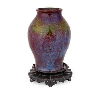 flambé-glazed earthenware, painted signature in green, with associated stand