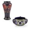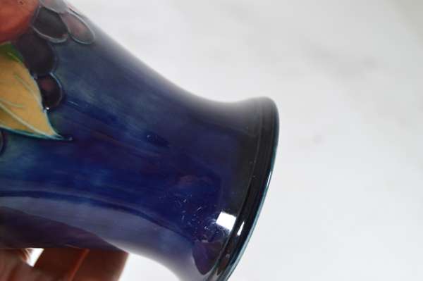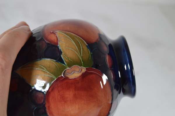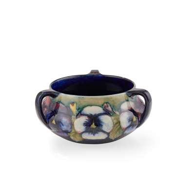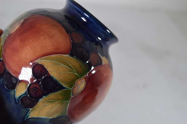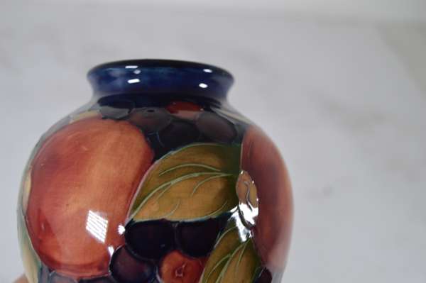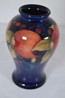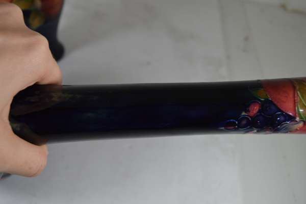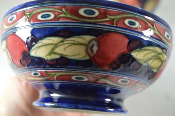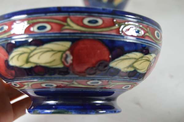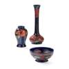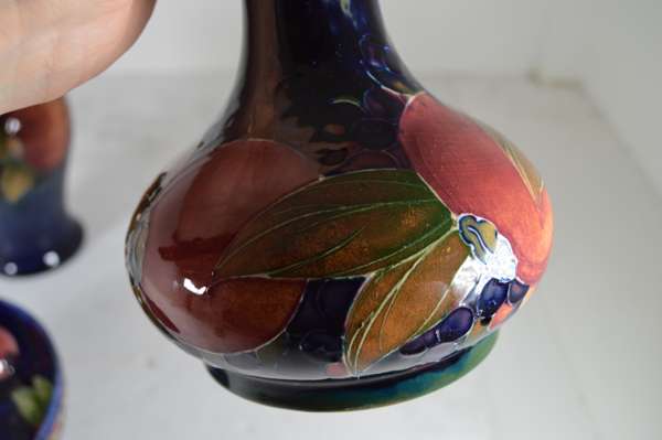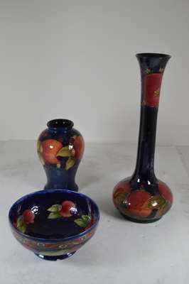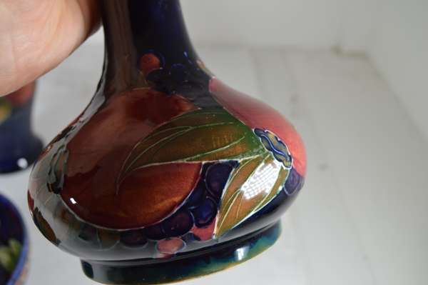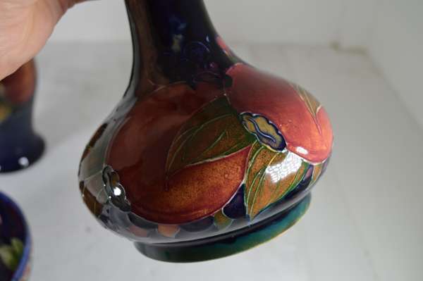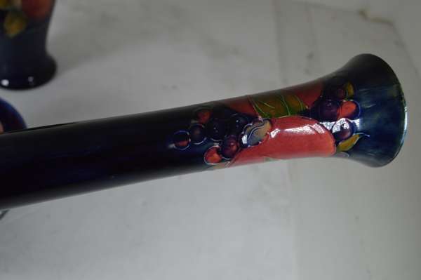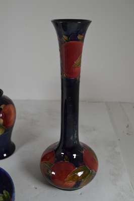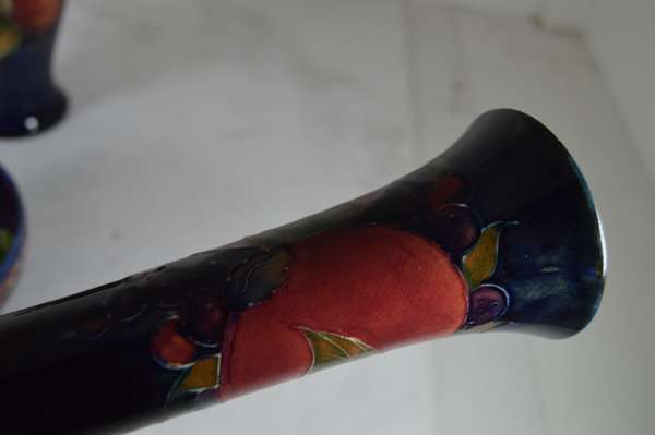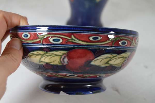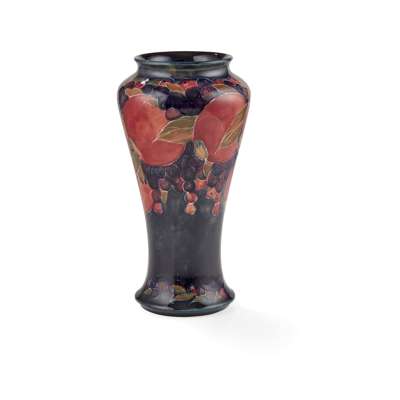 glazed earthenware, painted signature in green, impressed MOORCROFT/ BURSLEM/ ENGLAND/ M72, 26.5cm high; together with a ‘PANSIES’ THREE-HANDLED TYG, glazed earthenware, painted initials WM in blue, facsimile signature, impressed POTTER TO H.M. THE QUEEN/ MADE IN ENGLAND, 15cm diameter; a 'BANDED POMEGRANATE' BOWL, glazed earthenware, painted initials WM in blue, facsimile signature, impressed POTTER TO H.M THE QUEEN/ MADE IN ENGLAND, 15.5cm diameter; a ‘POMEGRANATE’ PATTERN TALL VASE, CIRCA 1915, glazed earthenware, with painted signature in green, impressed MOORCROFT/ BURSLEM/ ENGLAND, 12.5cm high; and a ‘POMEGRANATE’ PATTERN VASE, painted initials WM in blue, facsimile signature, impressed POTTER TO H.M THE QUEEN/ MADE IN ENGLAND, 16.5cm high