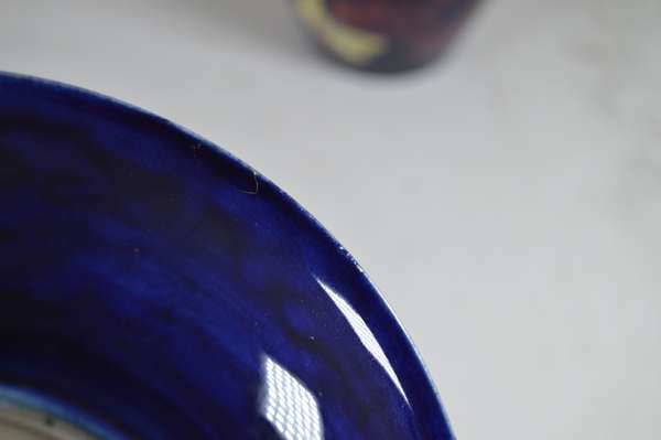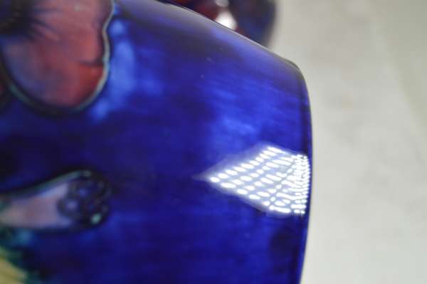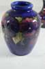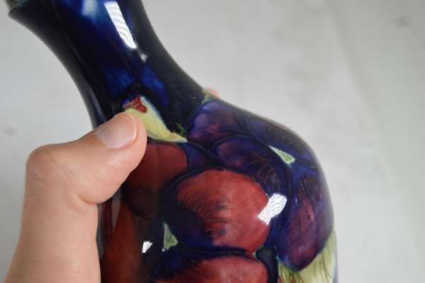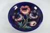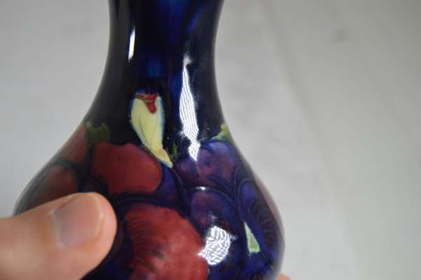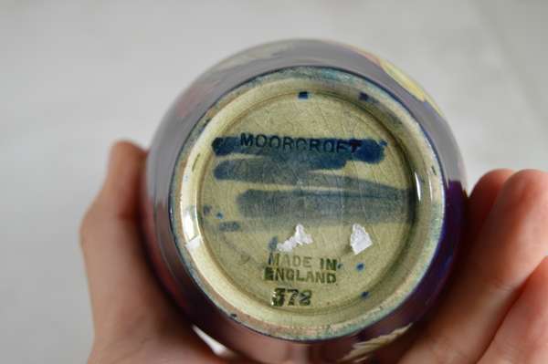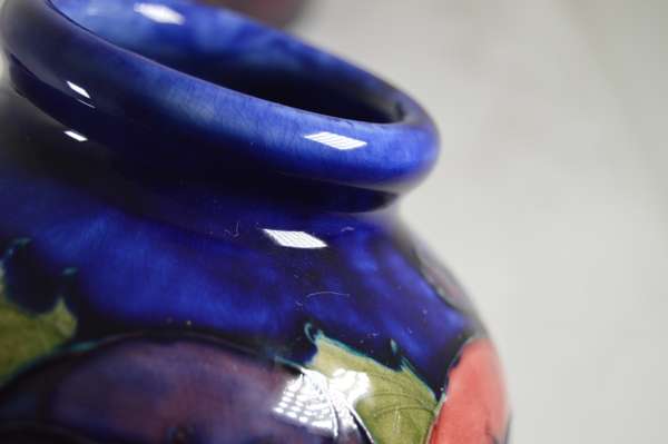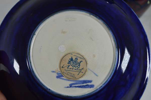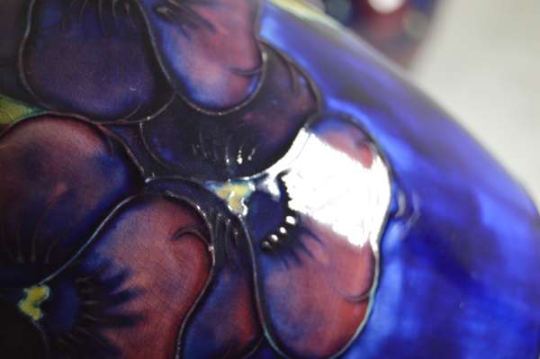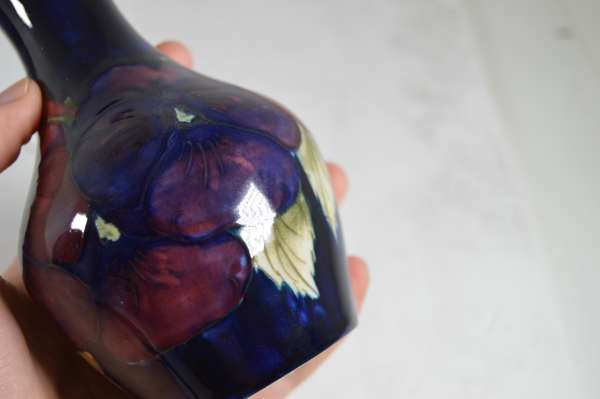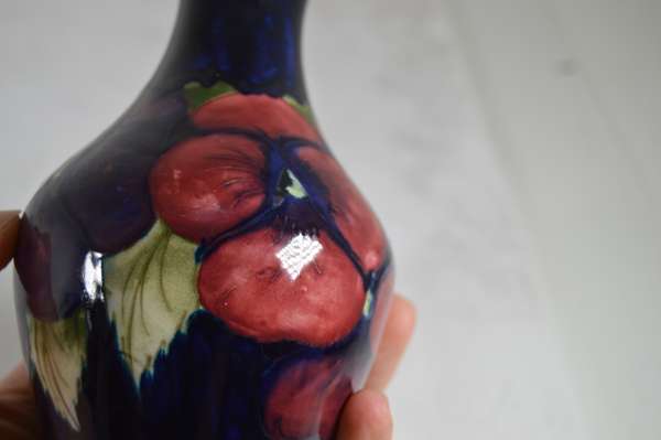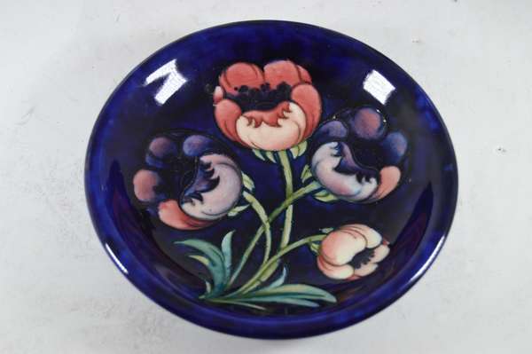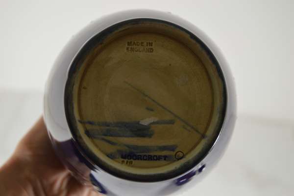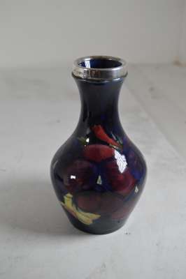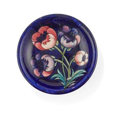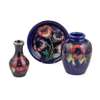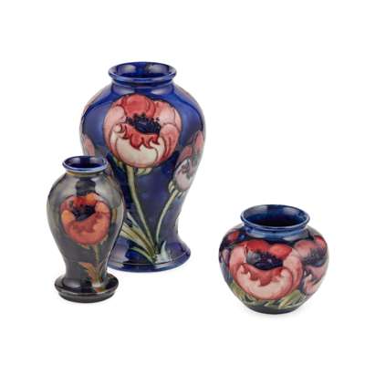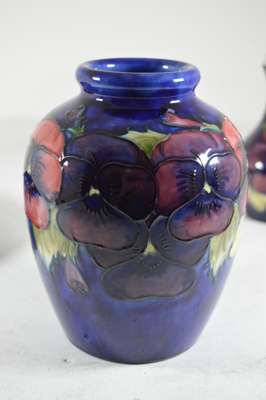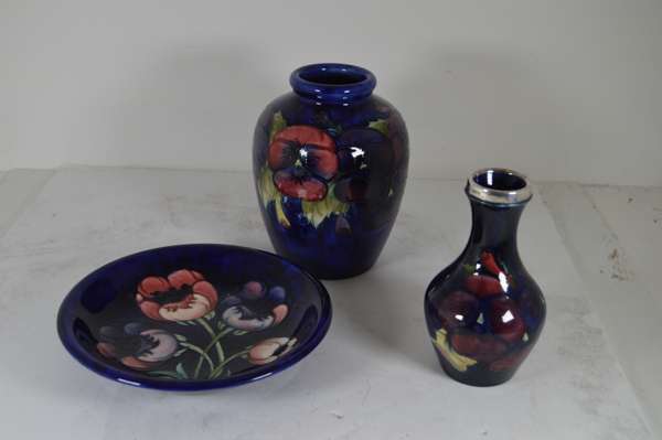 glazed earthenware, impressed MOORCROFT/ ENGLAND, 11cm high; together with a ‘BIG POPPY’ PATTERN BALUSTER VASE, glazed earthenware, painted signature in blue, impressed MOORCROFT/ MADE IN ENGLAND/ K, 16cm high; and a ‘BIG POPPY’ PATTERN MINIATURE VASE, impressed MOORCROFT/ MADE IN ENGLAND/ 55/ M, 7cm high; a 'BIG POPPY' PATTERN DISH, glazed earthenware, painted initials WM in blue, impressed MOORCROFT/ MADE IN ENGLAND, bears paper label BY APPOINTMENT/ W. MOORCROFT/ POTTERS TO H. M. THE QUEEN, 19cm diameter; together with a ‘PANSY’ PATTERN VASE, by William Moorcroft, glazed earthenware, painted initials WM in blue, impressed MOORCROFT/ MADE IN ENGLAND/ 216, 16.5cm high; and a further ‘PANSY’ PATTERN VASE, glazed earthenware, with applied silver plated rim, painted initials WM in blue, impressed MOORCROFT/ MADE IN ENGLAND/ 372, with stamped marks to mount, 14.5cm high