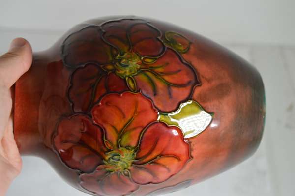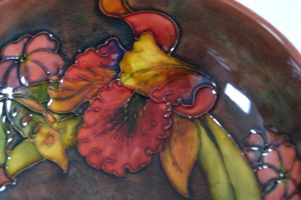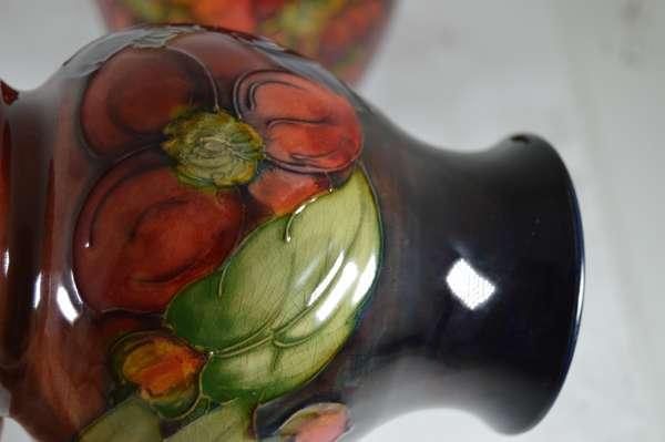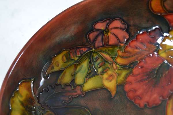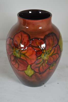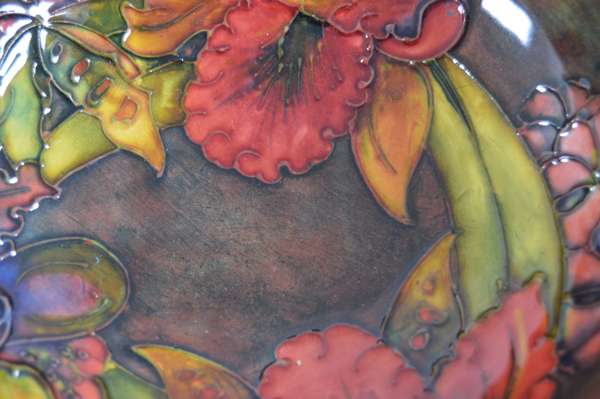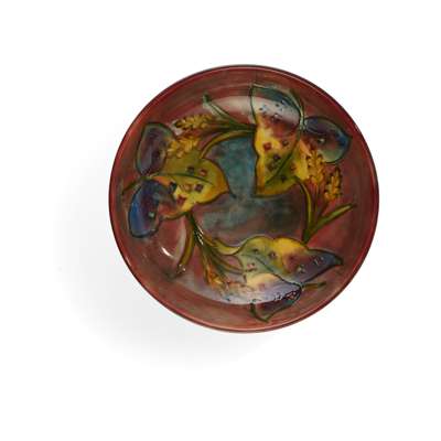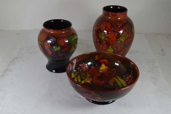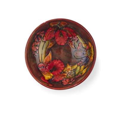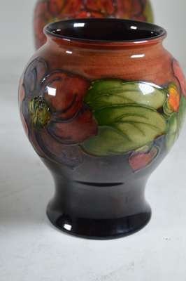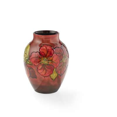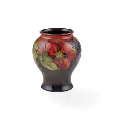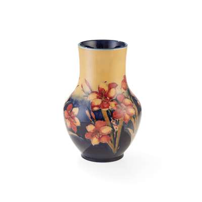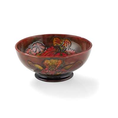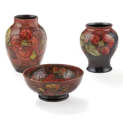 flambé-glazed earthenware, painted initials WM in blue, impressed MOORCROFT/ MADE IN ENGLAND, 23.5cm diameter; together with a ‘FREESIA’ PATTERN BALUSTER VASE, by William Moorcroft, glazed earthenware, painted signature in blue, facsimile signature and impressed POTTER TO H.M. THE QUEEN/ MADE IN ENGLAND, 27cm high; a 'CLEMATIS' PATTERN BALUSTER VASE, flambé-glazed earthenware, painted initials WM in blue, facsimile signature, impressed POTTER TO H.M. THE QUEEN/ MADE IN ENGLAND; 15cm high; a further ‘CLEMATIS’ PATTERN VASE by Walter Moorcroft, flambé-glazed earthenware, painted initials WM in blue, impressed MOORCROFT/ MADE IN ENGLAND, 18.5cm high; and an ‘ORCHID’ PATTERN BOWL, by Walter Moorcroft, flambé-glazed earthenware, painted initials WM in blue, impressed MOORCROFT/ MADE IN ENGLAND, 18.5cm diameter
