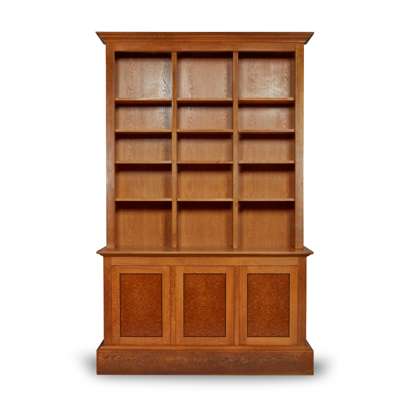 oak and burr walnut, with ebony lining, bears maker's label to one bookcase