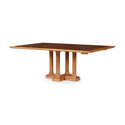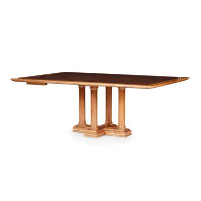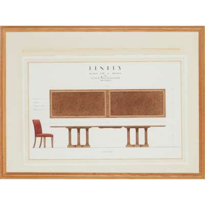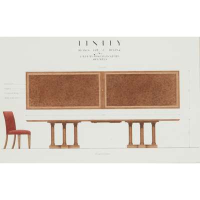 walnut, burr myrtle, maple and burr walnut, each table 200cm long 130cm deep, 74.5cm high; together with the ORIGINAL FRAMED DESIGN, pen & ink, watercolour, inscribed LINLEY/ DESIGN FOR A DINING (sic) 36cm x 56cm