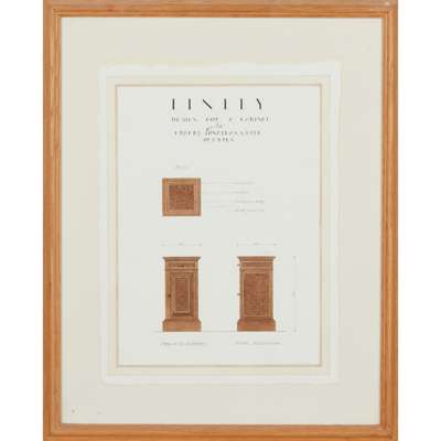 walnut, burr myrtle, maple and burr walnut, 46cm wide, 91cm high, 46cm deep; together with the ORIGINAL FRAMED DESIGN, pen & ink, watercolour, inscribed LINLEY/ DESIGN FOR A CABINET, 39cm x 29cm