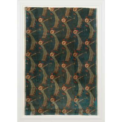 Note: Herbert Horne was a writer, architect, designer and member of the Century Guild. He was apprenticed to Arthur Heygate Mackmurdo in 1883 and the two were business partners from 1885 to 1890. The Century Guild was established in 1883 by A. H. Mackmurdo and Selwyn Image with several others, including Horne. This design is one of the most recognisable designs produced by the Century Guild. Known as 'Angel with Trumpet' or 'Praise of the Soul' it was exhibited at a number of exhibitions for the Century Guild. Not all contemporary critics were impressed, one reviewer of the 1897 Manchester Royal Jubilee exhibition in the Journal of Decorative Art described it as 'at the best a very weak effort'. Nevertheless, it is now seen as exemplifying the Guild's swirling designs that pre-empted the Art Nouveau era. As well as velveteen it was also produced as printed cotton. The two differ in one detail; in the cotton, the angel's halo contains a cross (usually signifying Jesus Christ), in the present velveteen example it has a dot, which may suggest that Horne amended the design, and that the velveteen was produced after the cotton.