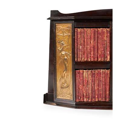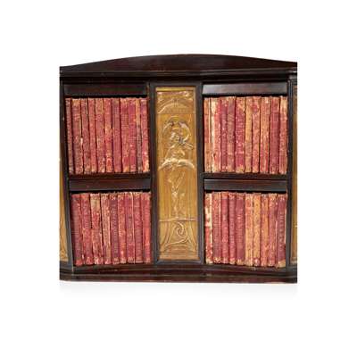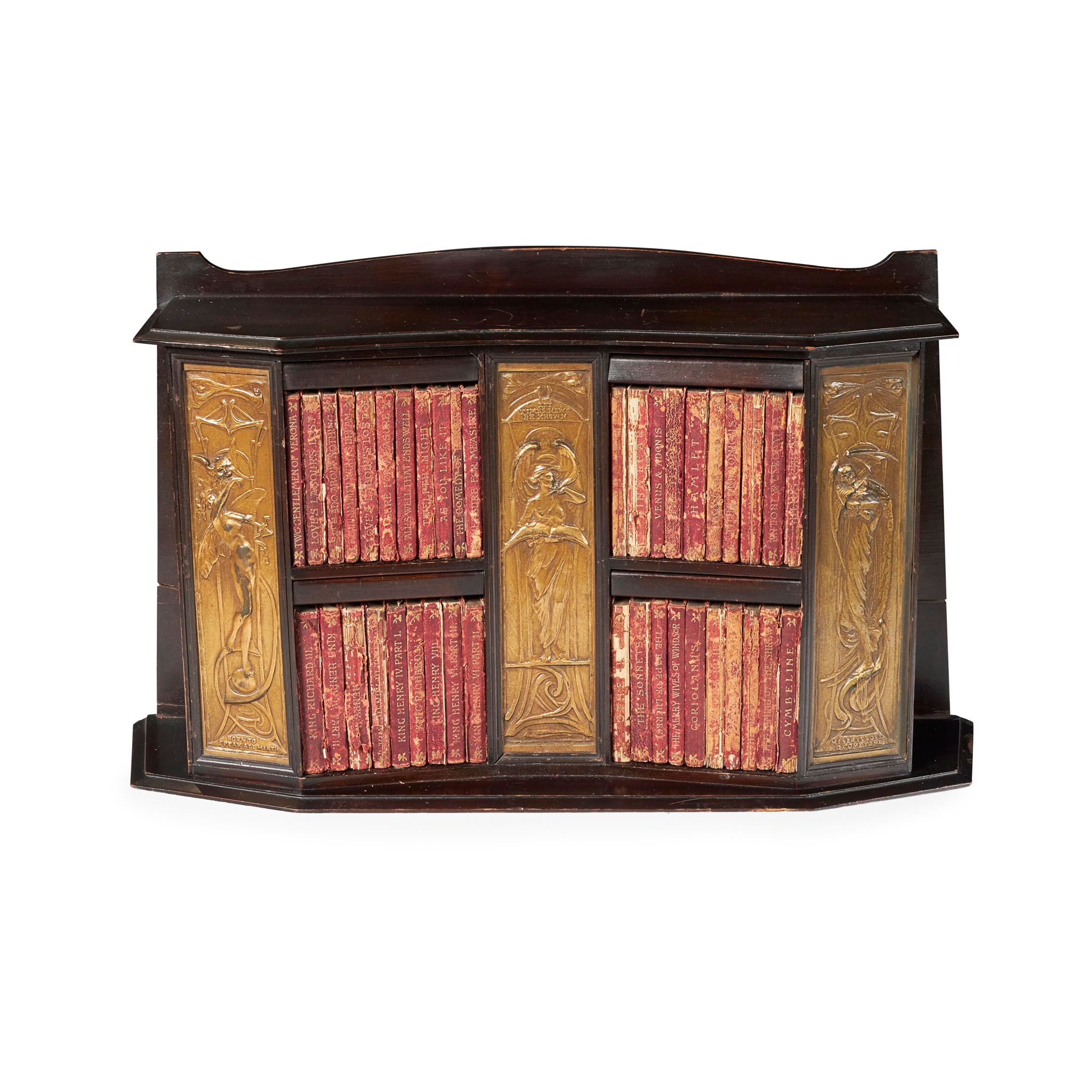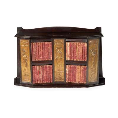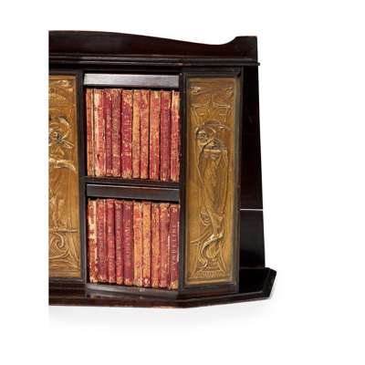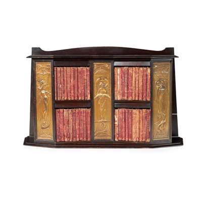 stained beech, inset with cast brass panels, with volumes of Shakespeare