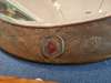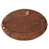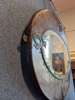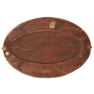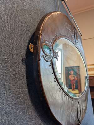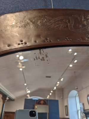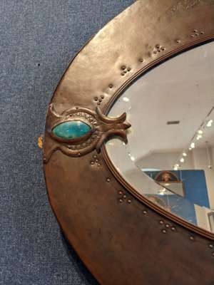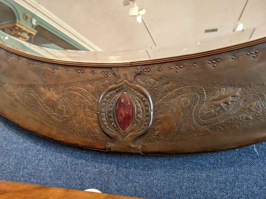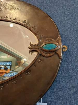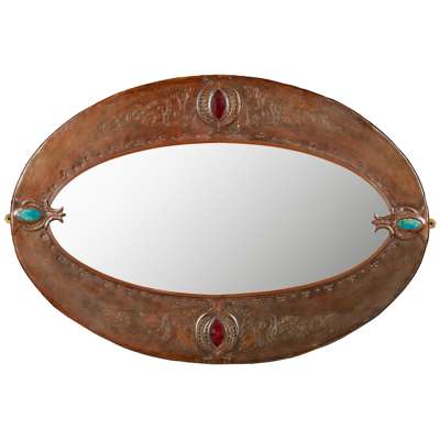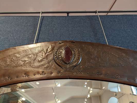chased and repoussé-decorated copper, ceramic panels, mirrored glass plate