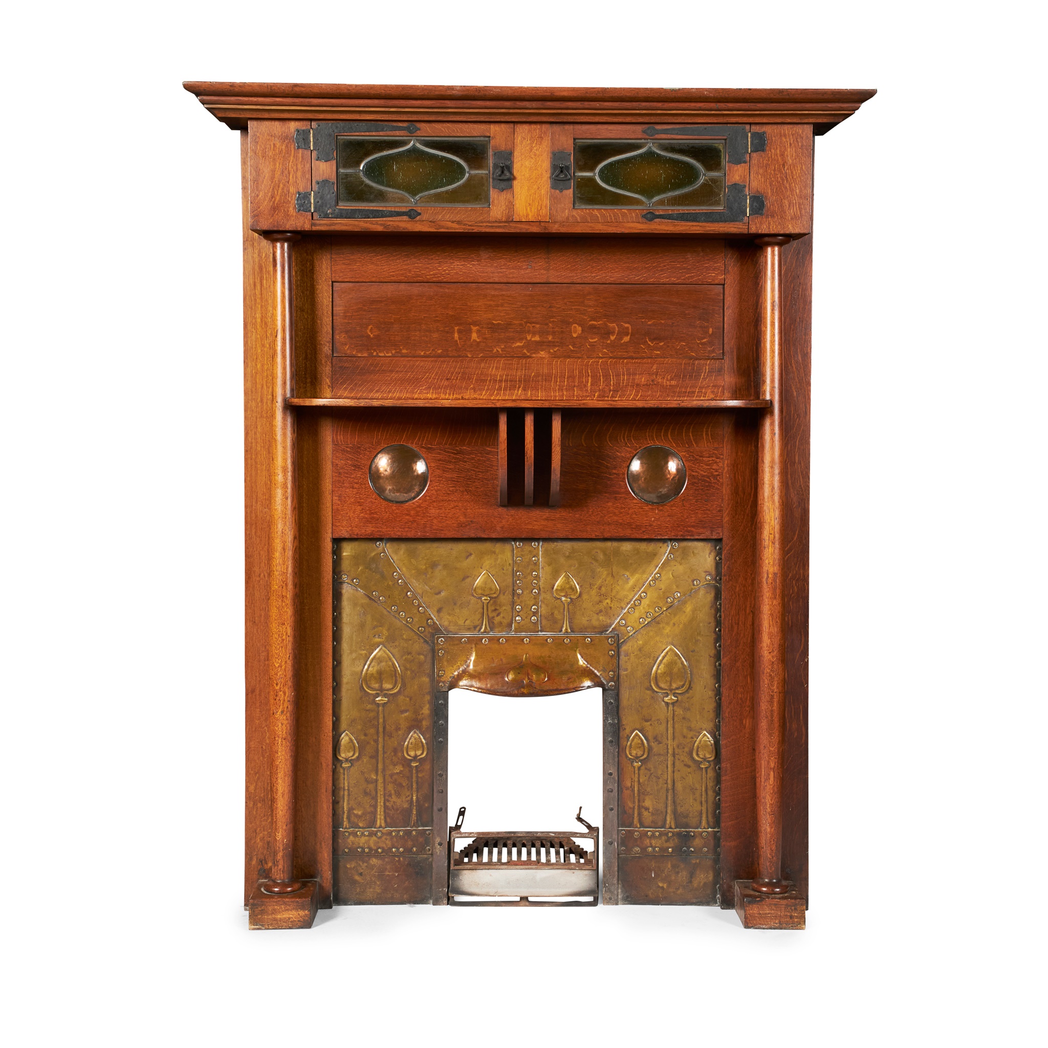 oak, stained and leaded glass, inset with copper roundels and patinated metal fittings, with brass insert and wrought iron fire grate