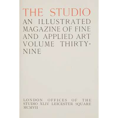 hard cloth-bound with gilt-tooling , comprising volumes 13 (2); 14; 15; 16; 17; 23; 39; 40; 41; 43; 46; 47; 48; 50; 53; 54; 55; 58; 59; 60; 61; 62; 63; 64; together with THE STUDIO YEARBOOKS, hard and soft cloth and paper-bound, various editions including 1903-04; 1904 (2); 1906; 1909; 1910; 1914 (2); 1916; 1923; a collection of THE STUDIO MAGAZINE, various paper-backs, comprising Oct-Dec 1902; Jan 1903 ; June - Dec 1905; Jan-July and Sept-Dec 1906; Jan-June 1907; Oct-Dec 1908 and Jan-March and August 1909; and MODERN WOODCUTS AND LITHOGRAPHS BY BRITISH ARTISTS: A SPECIAL EDITION OF THE STUDIO 1919, cloth-bound with gilt-tooling