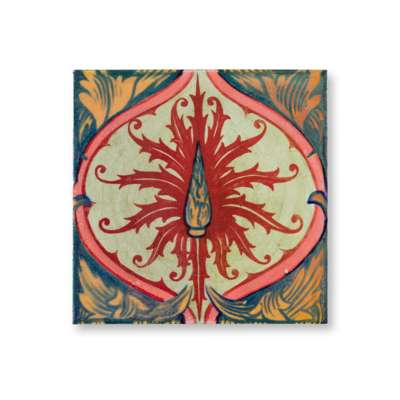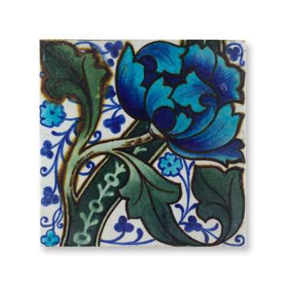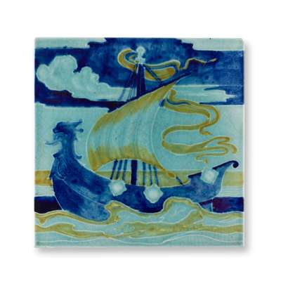 glazed earthenware, comprising a CARTER & CO. 'LONGBOAT' TILE, 15.2cm square; a CRAVEN DUNNILL LUSTRE TILE, 15.4cm square; a CARTER & CO. PEACOCK TILE, 15cm square; an IZNIK TILE, probably Craven Dunnill, 15cm square; and FOUR VICTORIAN TILES, printed with a poppy design, each with registered number 22570, 15.2cm square