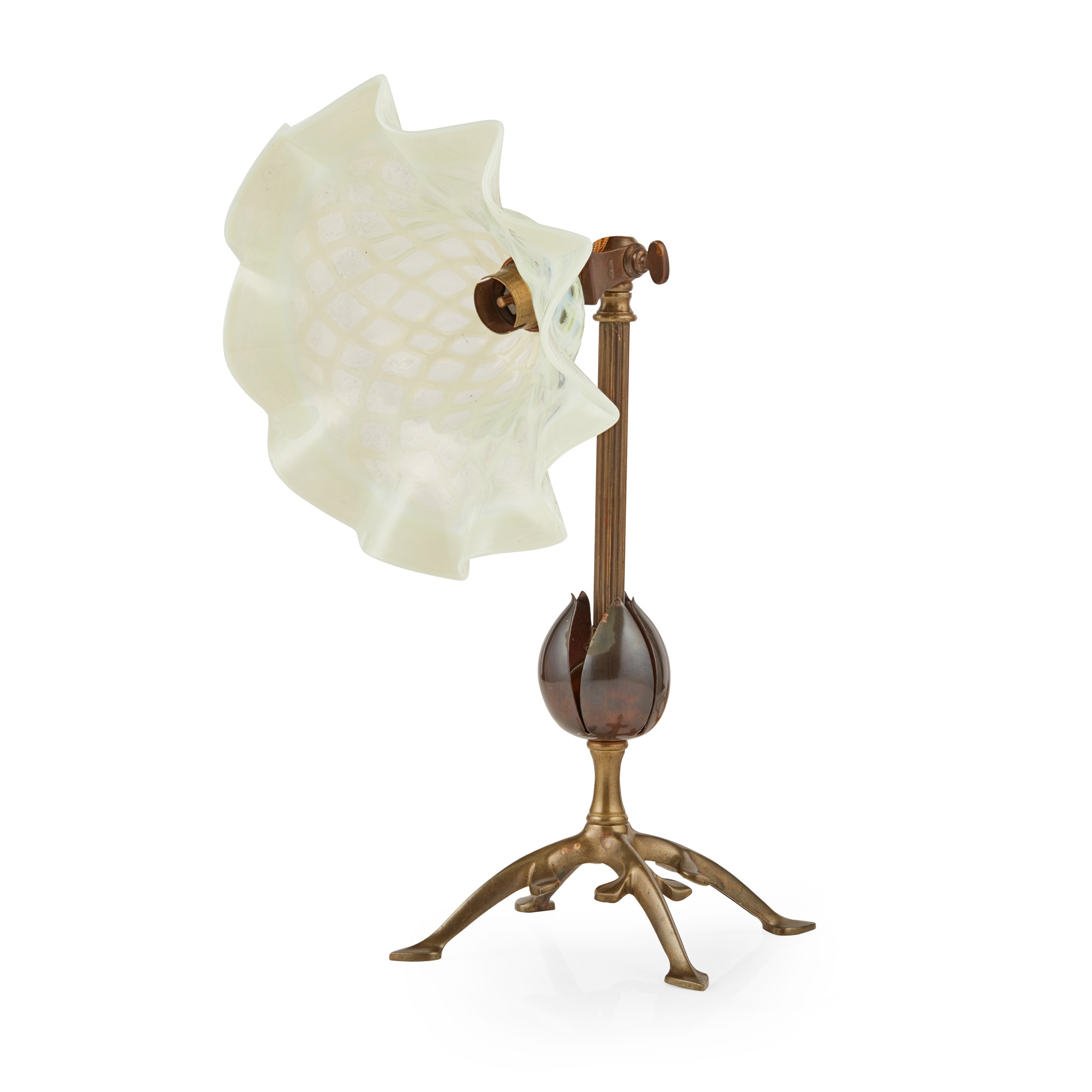 brass and copper, with associated opalescent glass shade by James Powell & Sons, stamped to fitting BENSON