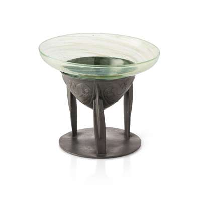 pewter stand and 'Clutha' glass bowl with aventurine inclusions, manufactured by James Couper & Sons, Glasgow, stamped TUDRIC/ 0276