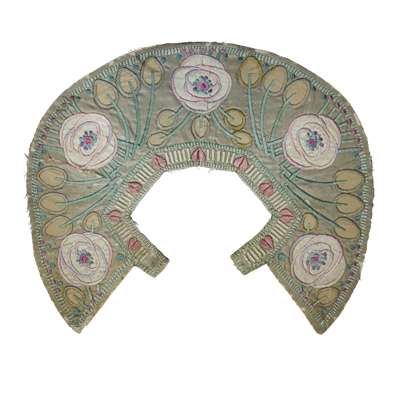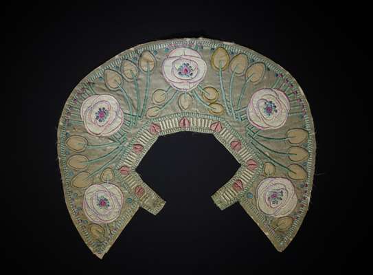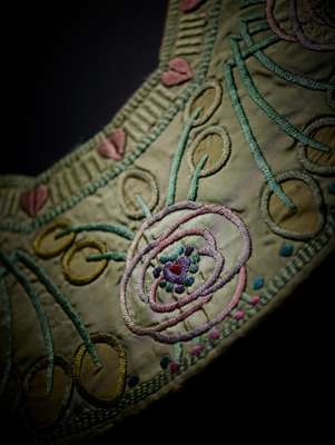 It must be said that whilst this design of this collar may appear simple to the eye it is deceptively so, as it demands a remarkable level of skill and creativity from the embroiderer. The arrangement of abstracted plant forms and expressive linear patterns come together in perfect symmetry and sit in harmony with the pastel-coloured silk threads chosen. The complexity of the stitching techniques employed also speak to the unique skills and knowledge of the embroiderer. Each component in the design has been worked with a great deal of silk threads and yet every rose bud and petal appears entirely uniform: the expressive stitching no doubt helps the design achieve a certain feeling of weight and energy which brings the piece to life. A careful balance of practicality and beautiful decoration, this rare collar showcases the enchanting designs of Ann Macbeth which were a significant contribution in the evolution of the iconic Glasgow style.