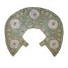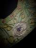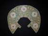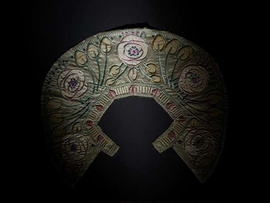 As a teacher, taking inspiration from William Morris’ Arts & Crafts ideals, Macbeth encouraged students to be inspired by nature as a source of ideas, a view which is clearly demonstrated in the design of this collar. Filled with friezes of intertwined leaves, petals and stylised rosebuds, Macbeth looks to traditional stitching methods of the past in a bid to achieve an expressive, yet elegant garment; the design of which is entirely original. Whilst Newbery’s earlier pieces take inspiration from the simple and delicate designs of the Renaissance, Macbeth tended to embellish her pieces with elaborate metal clasps and other decorative fastenings. Richly embroidered in brightly coloured threads, her pieces became popular for their practicality as well as their beautiful designs.